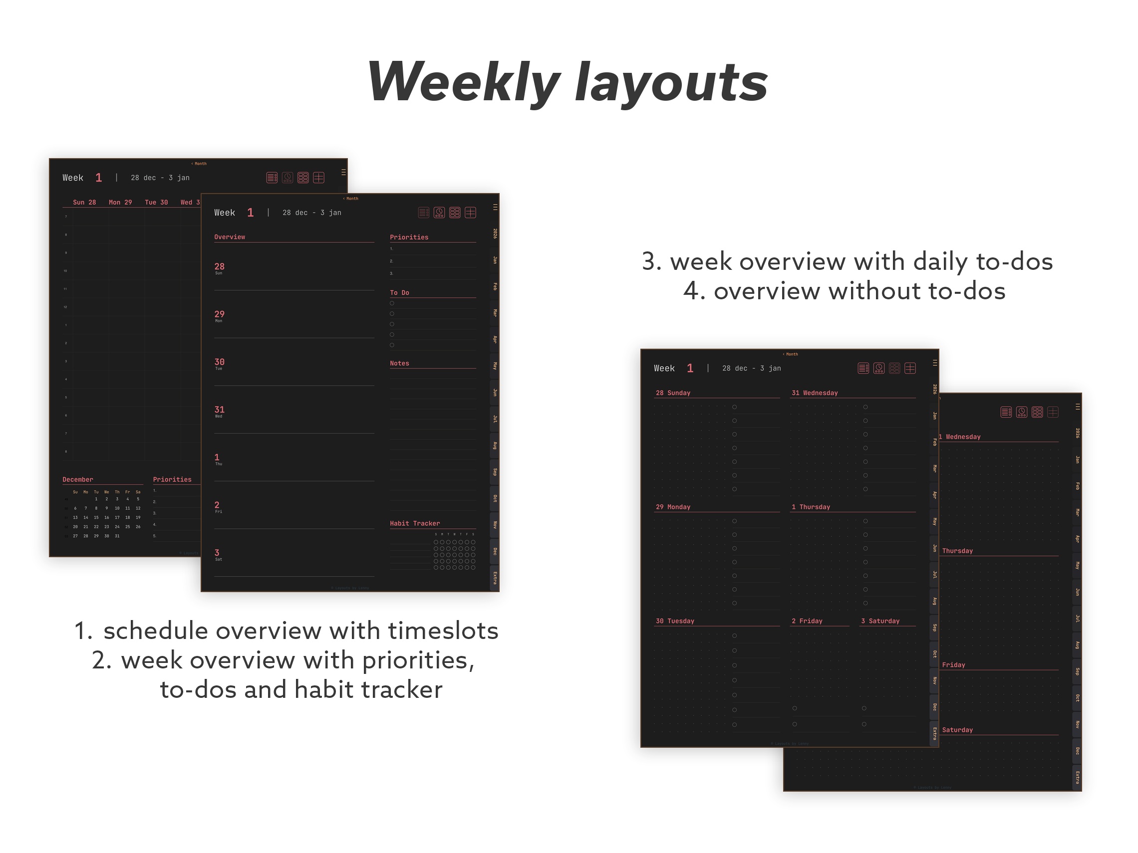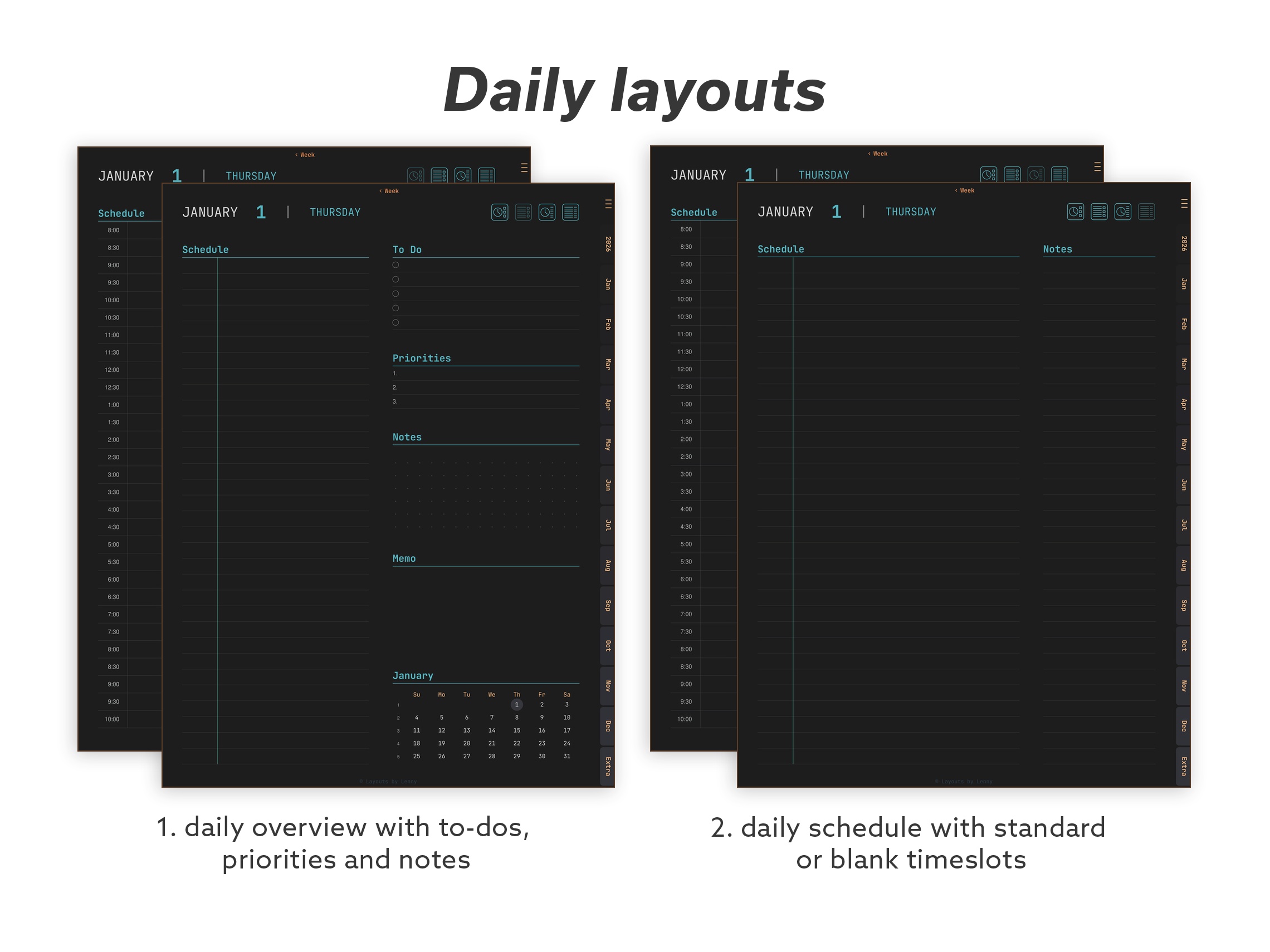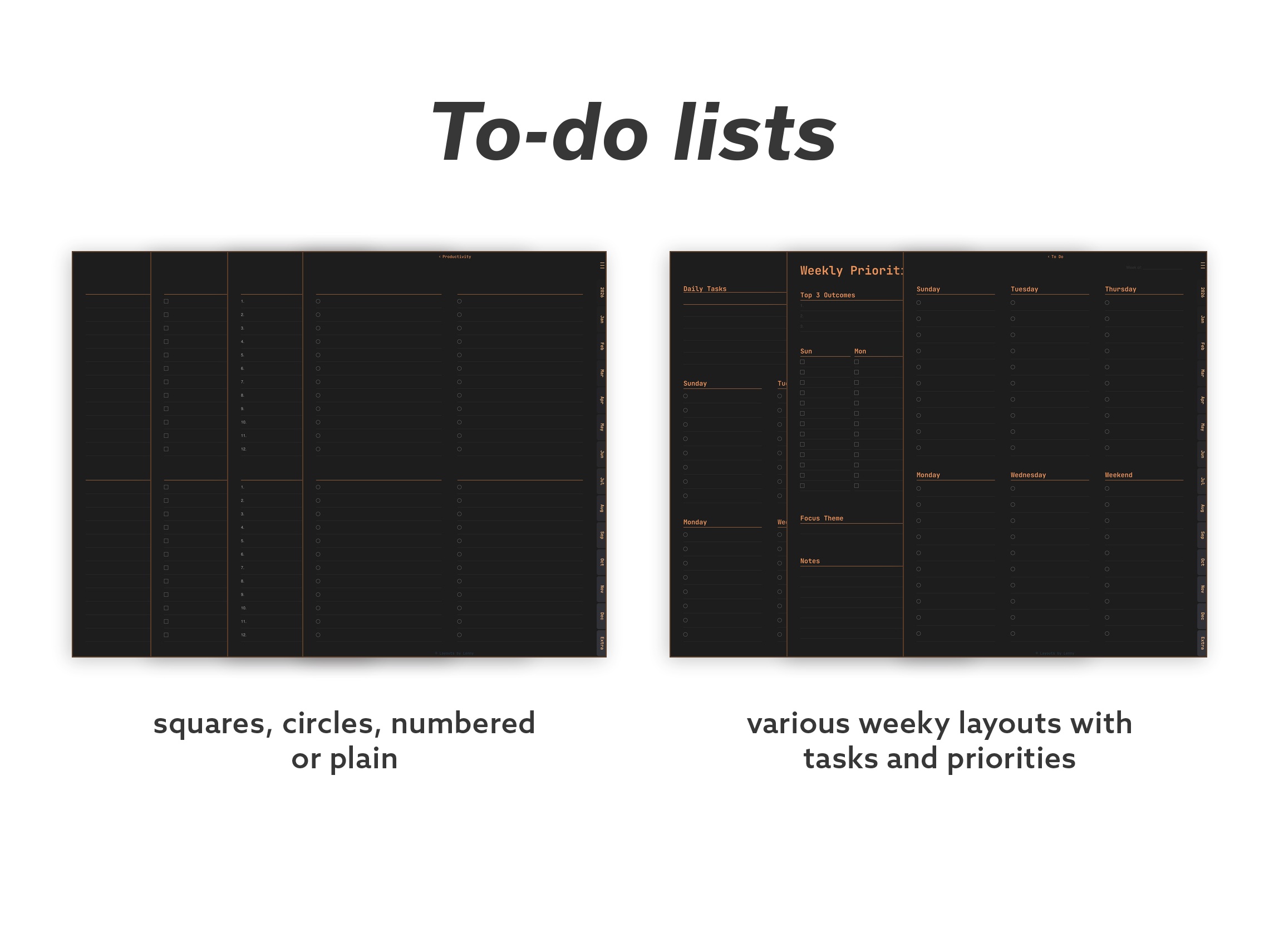 Focus – A curated set for everyday planning. Core calendar layouts, habit tracking, meal and sleep trackers, productivity tools, and essential note pages – without the extras.