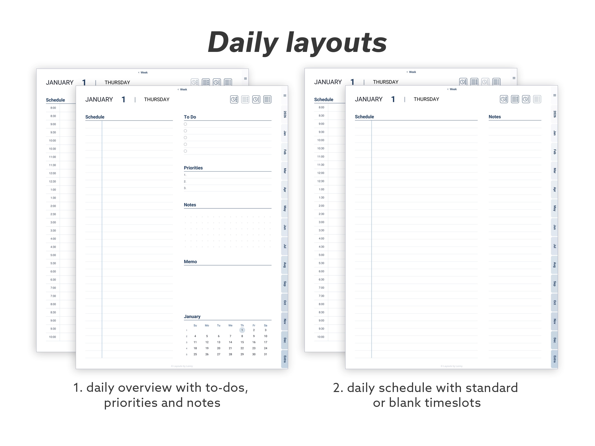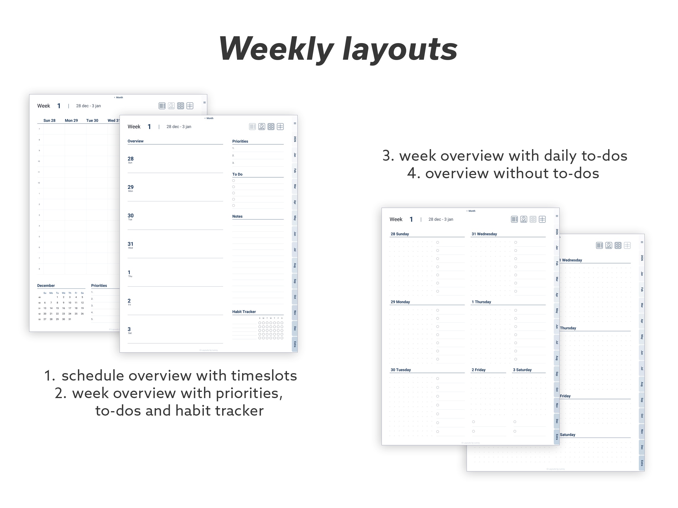 Focus – A curated set for everyday planning. Core calendar layouts, habit tracking, meal and sleep trackers, productivity tools, and essential note pages – without the extras.