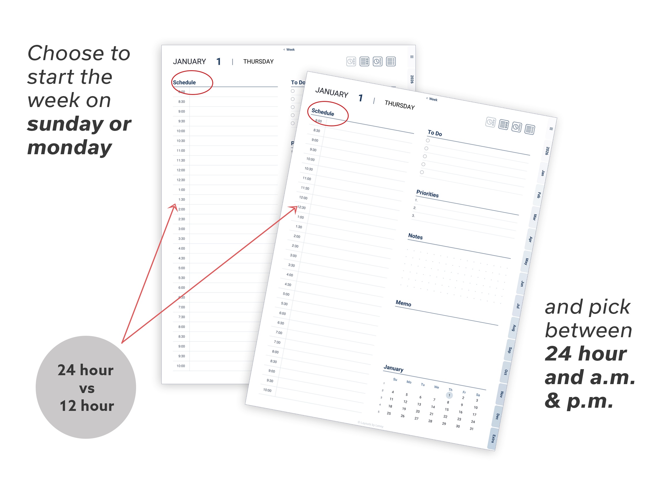 After purchase, you get access to our download library. Pick your version, choose your week start (Monday or Sunday), time format (24h or AM/PM), and download. That's it.