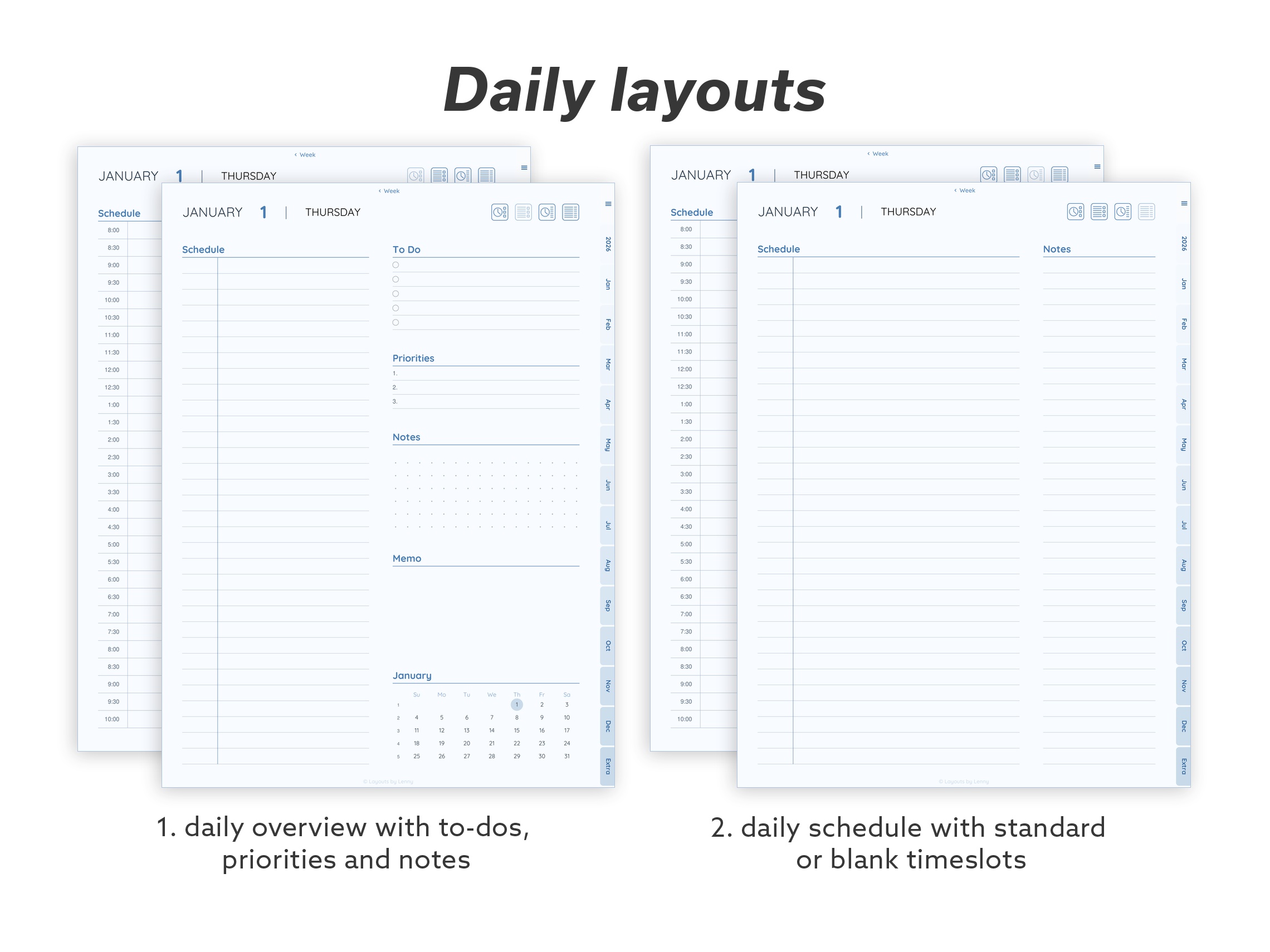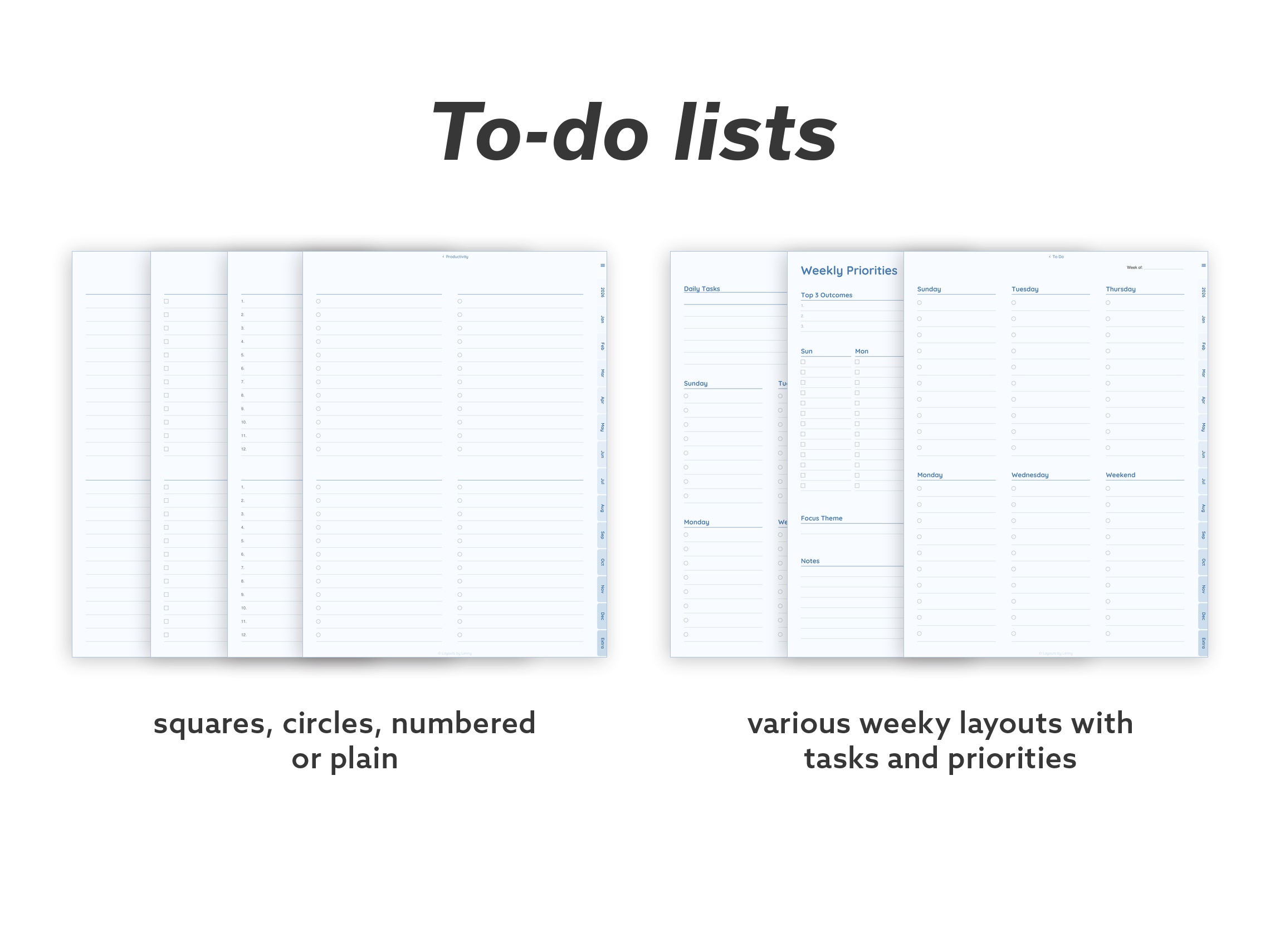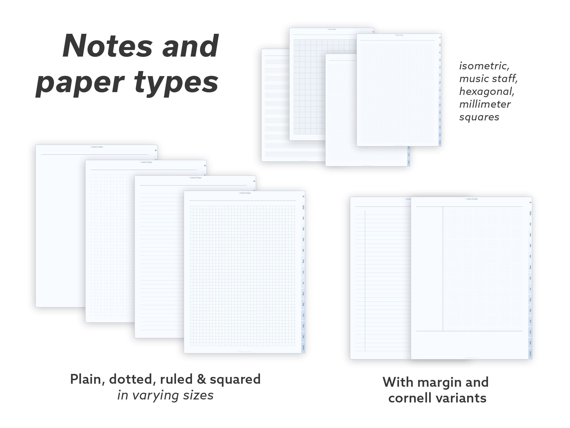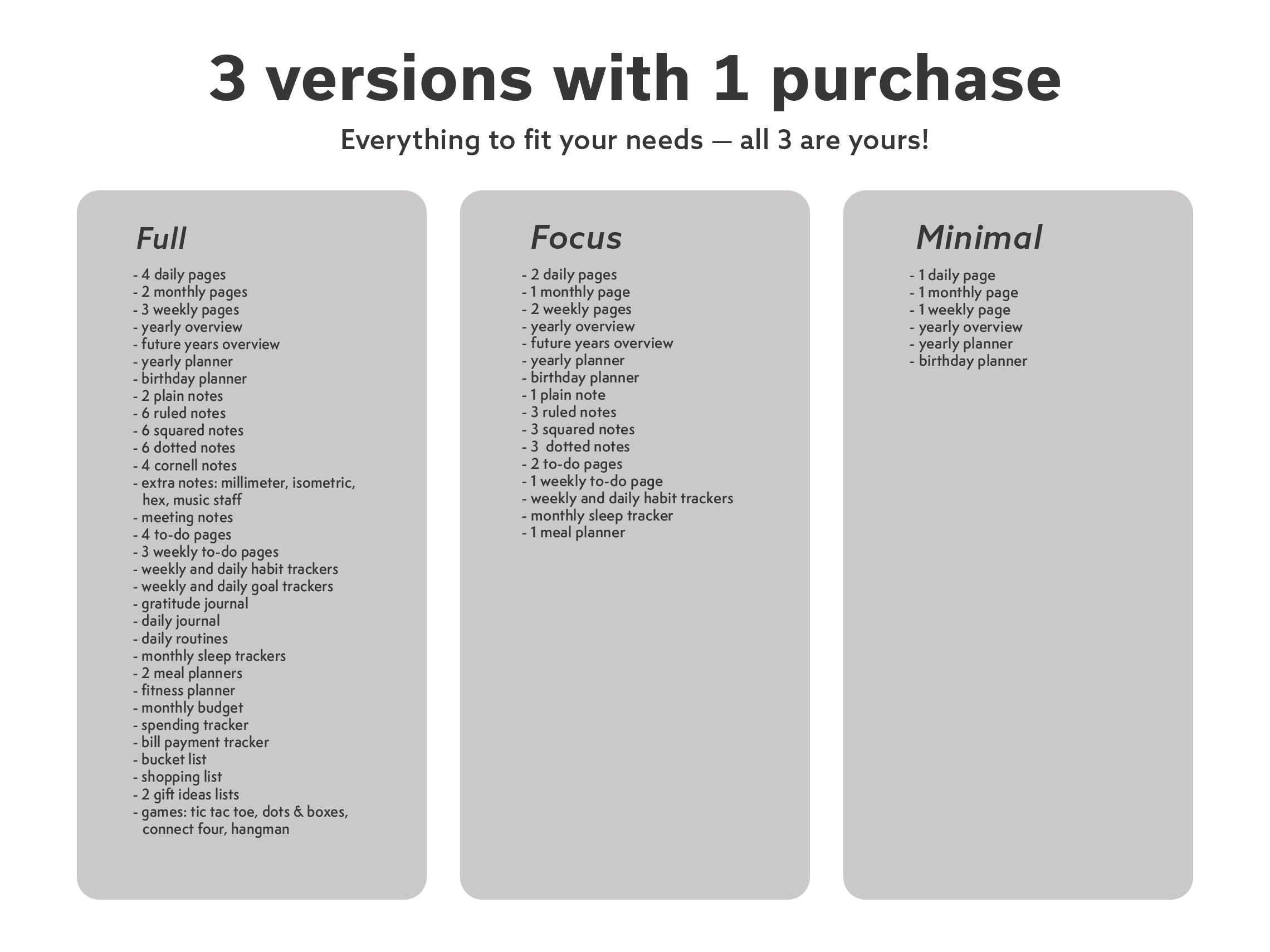 Focus – A curated set for everyday planning. Core calendar layouts, habit tracking, meal and sleep trackers, productivity tools, and essential note pages – without the extras.
