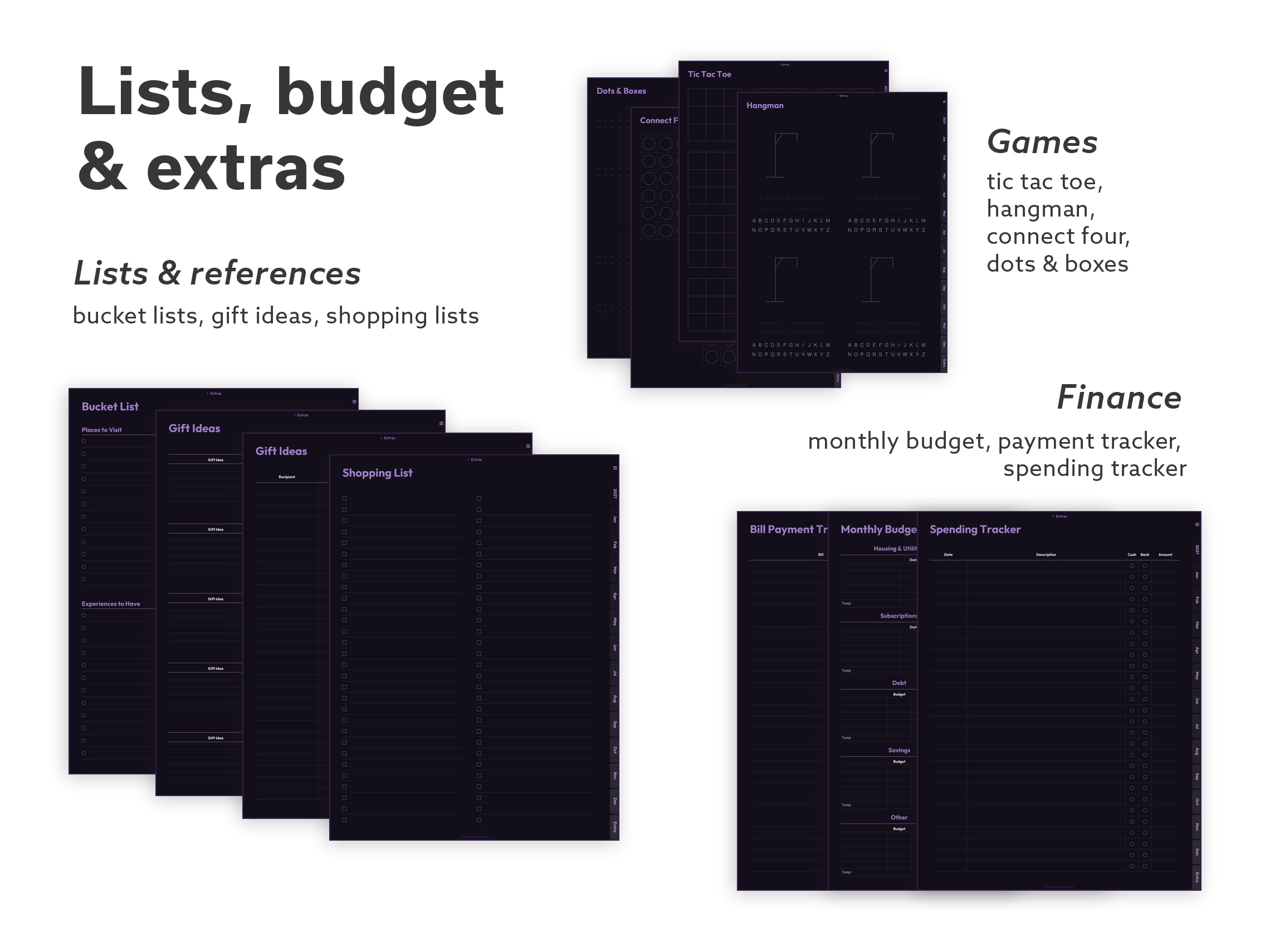 Full – The complete collection. Every layout, every tool, every paper style. Multiple weekly and daily formats, goal and habit trackers, budget tools, wellness pages, gratitude journaling, Cornell notes, specialty paper (isometric, hex, music staff), and a few classic games for screen breaks.