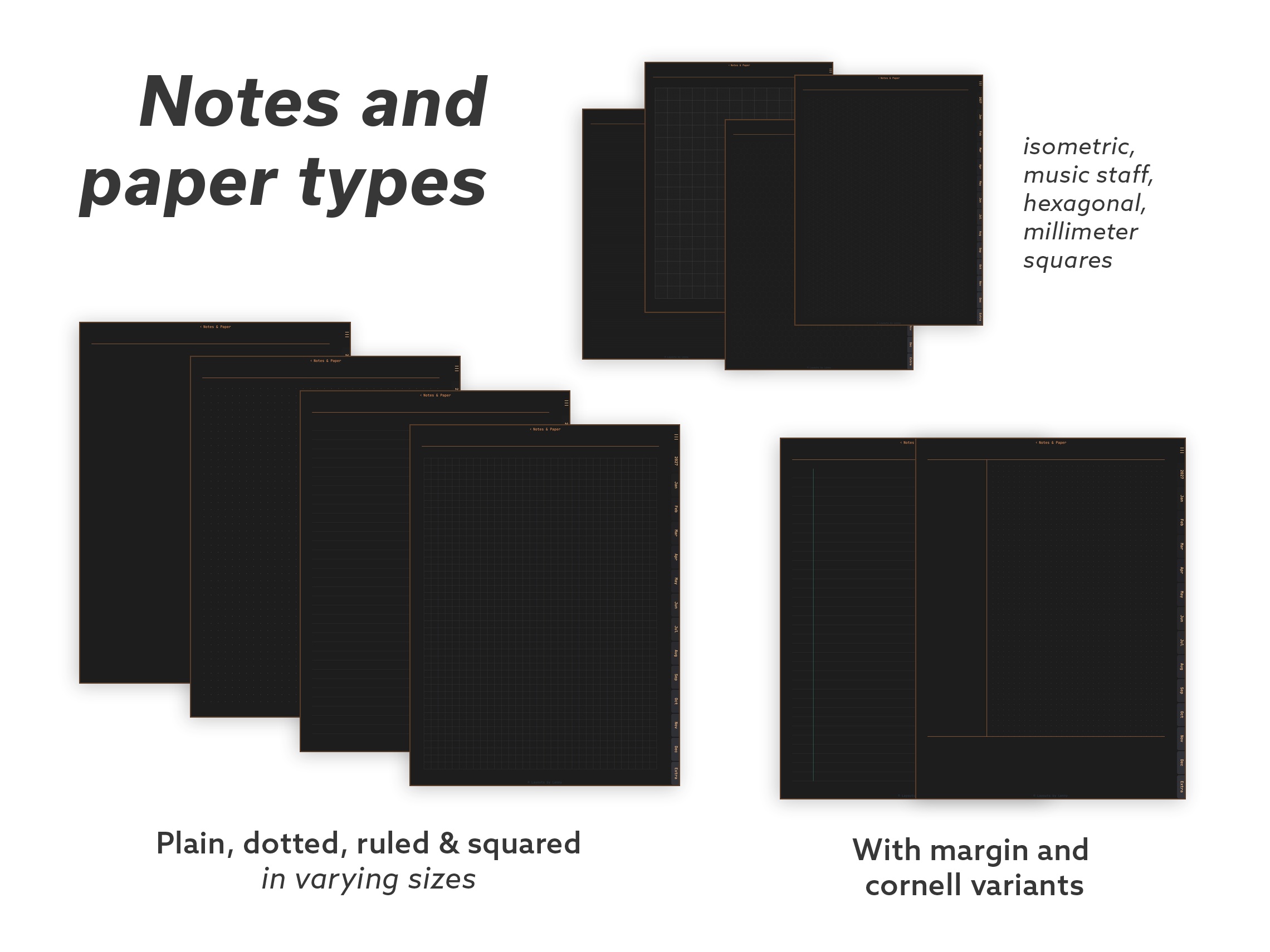 Full – The complete collection. Every layout, every tool, every paper style. Multiple weekly and daily formats, goal and habit trackers, budget tools, wellness pages, gratitude journaling, Cornell notes, specialty paper (isometric, hex, music staff), and a few classic games for screen breaks.
