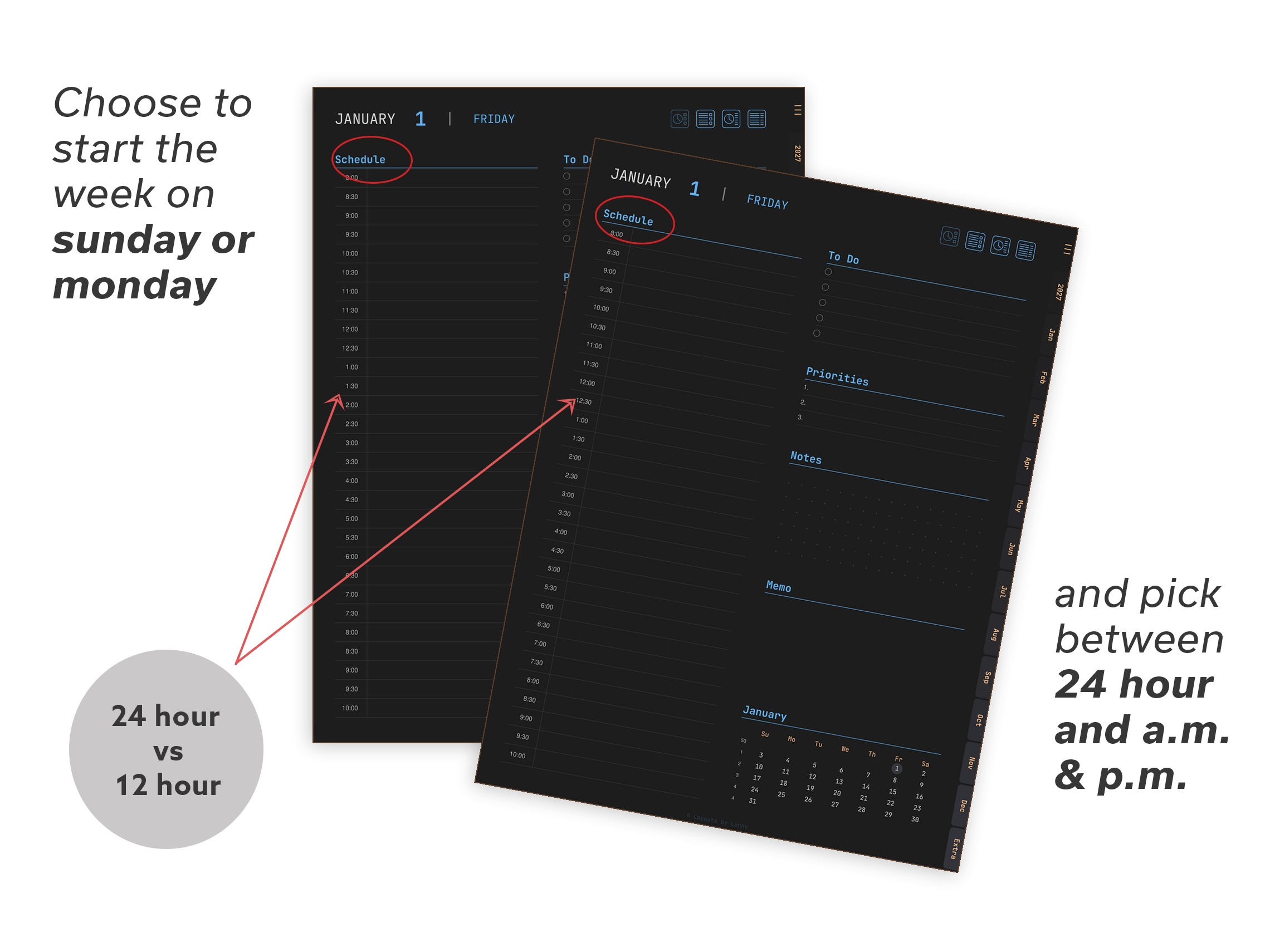 After purchase, you get access to our download library. Pick your version, choose your week start (Monday or Sunday), time format (24h or AM/PM), and download. That's it.