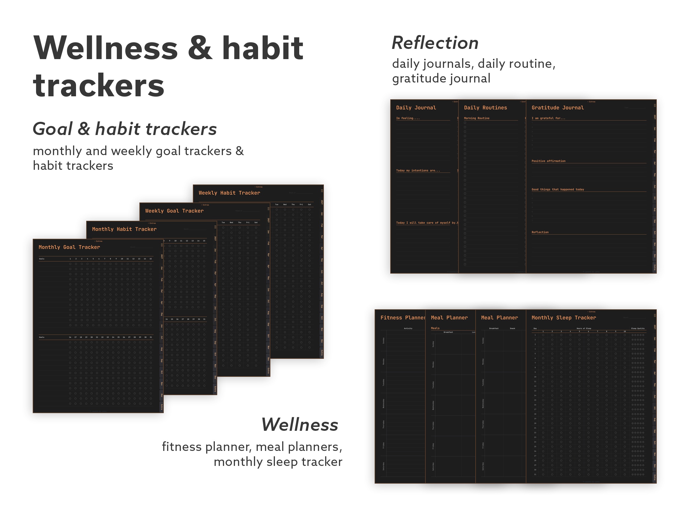 Focus – A curated set for everyday planning. Core calendar layouts, habit tracking, meal and sleep trackers, productivity tools, and essential note pages – without the extras.