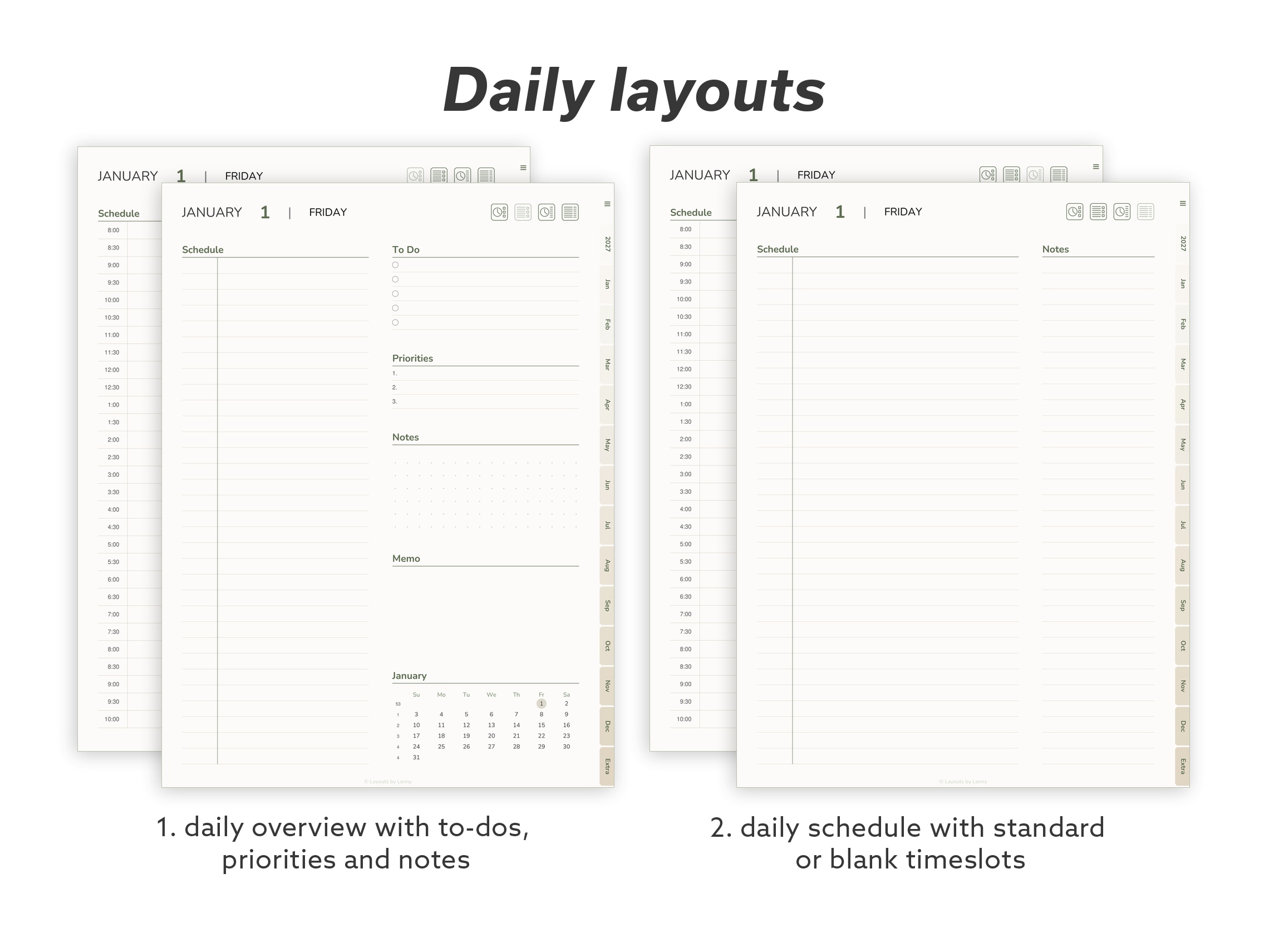 Focus – A curated set for everyday planning. Core calendar layouts, habit tracking, meal and sleep trackers, productivity tools, and essential note pages – without the extras.