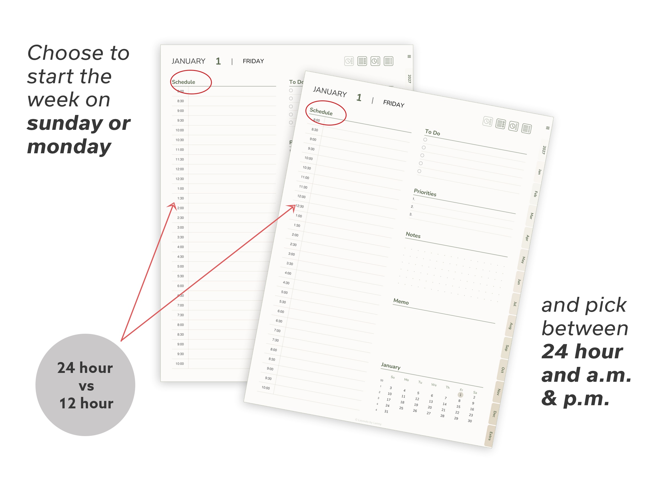 After purchase, you get access to our download library. Pick your version, choose your week start (Monday or Sunday), time format (24h or AM/PM), and download. That's it.
