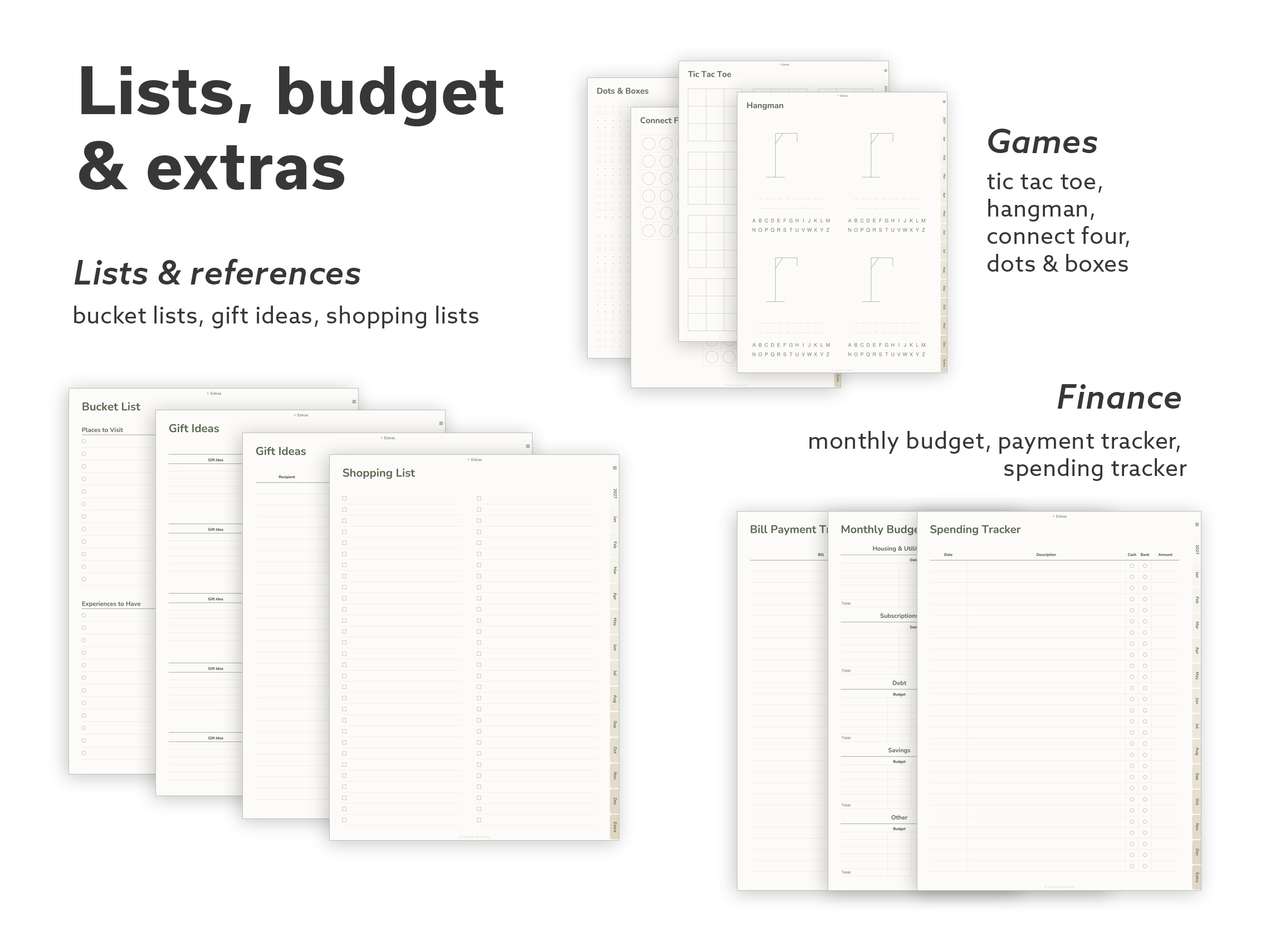 Full – The complete collection. Every layout, every tool, every paper style. Multiple weekly and daily formats, goal and habit trackers, budget tools, wellness pages, gratitude journaling, Cornell notes, specialty paper (isometric, hex, music staff), and a few classic games for screen breaks.