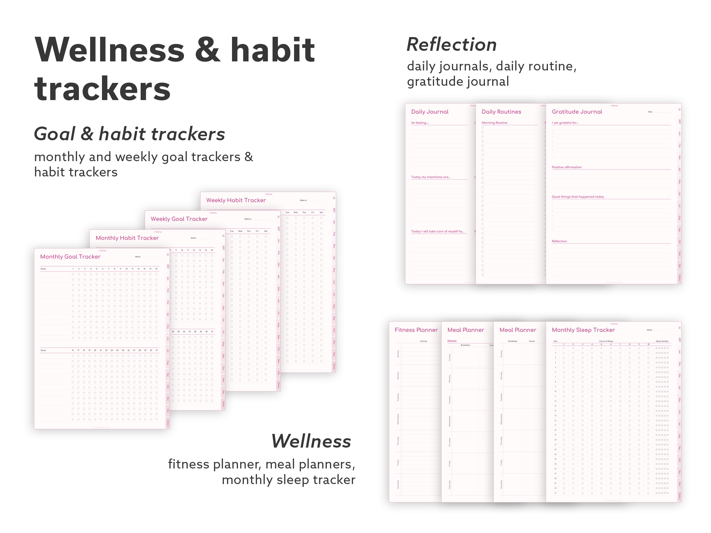 Focus – A curated set for everyday planning. Core calendar layouts, habit tracking, meal and sleep trackers, productivity tools, and essential note pages – without the extras.