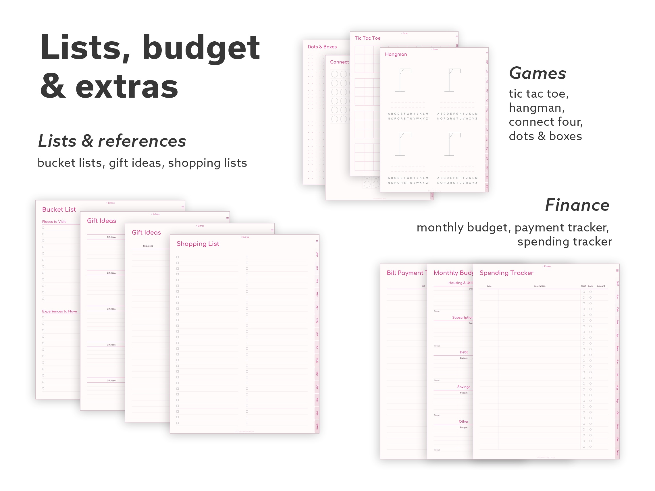 Full – The complete collection. Every layout, every tool, every paper style. Multiple weekly and daily formats, goal and habit trackers, budget tools, wellness pages, gratitude journaling, Cornell notes, specialty paper (isometric, hex, music staff), and a few classic games for screen breaks.