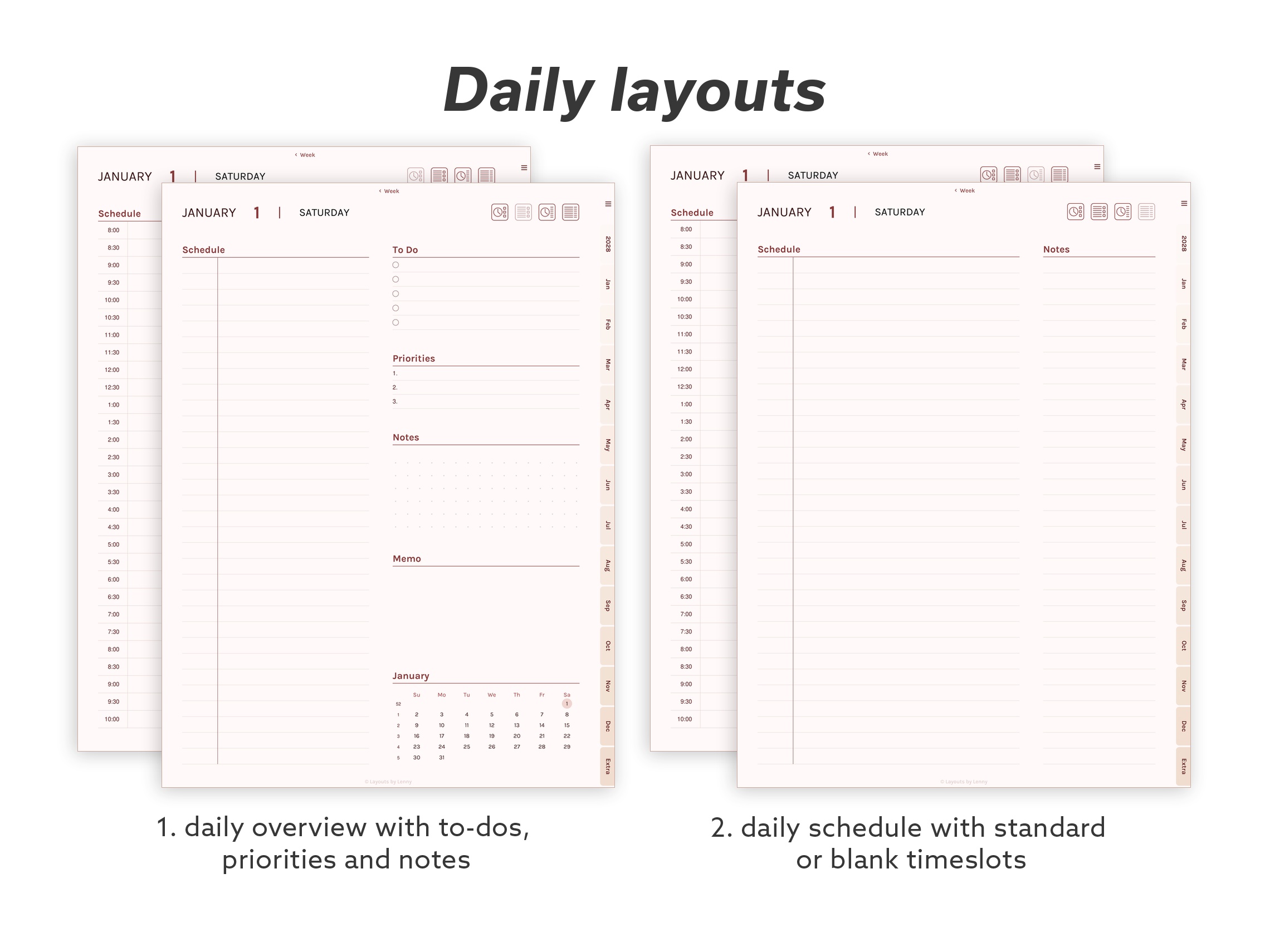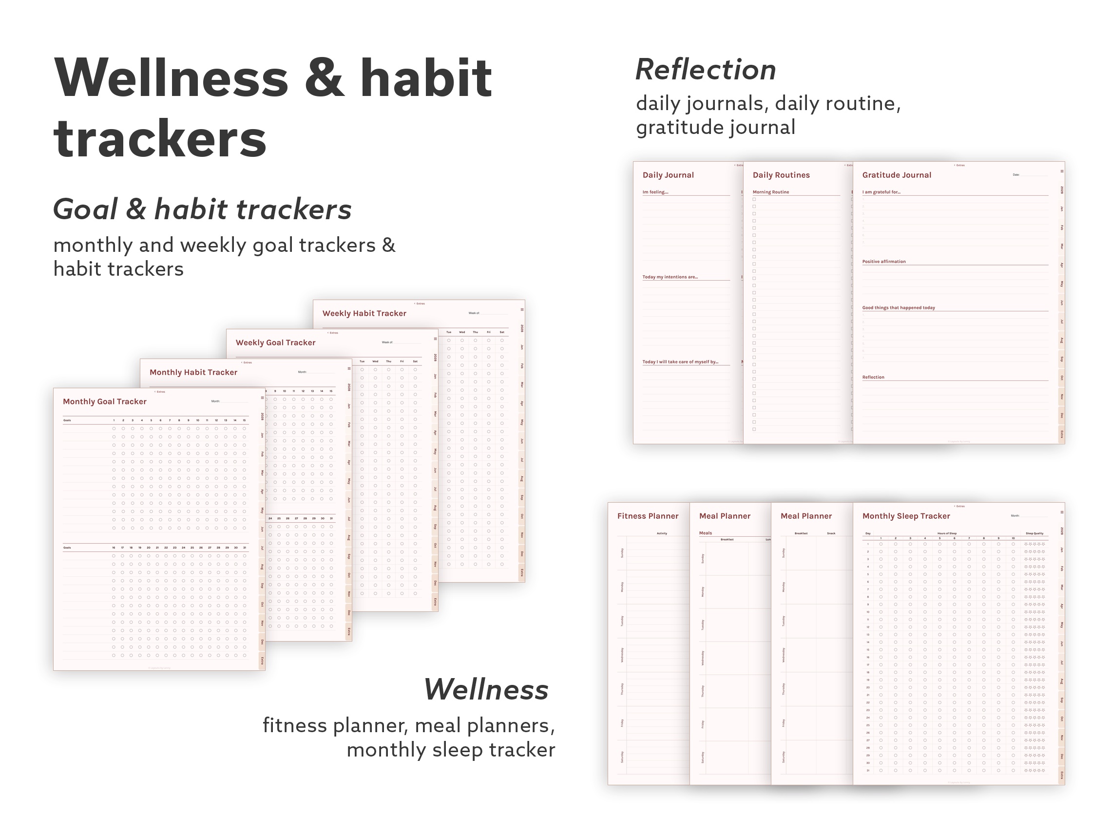Focus – A curated set for everyday planning. Core calendar layouts, habit tracking, meal and sleep trackers, productivity tools, and essential note pages – without the extras.