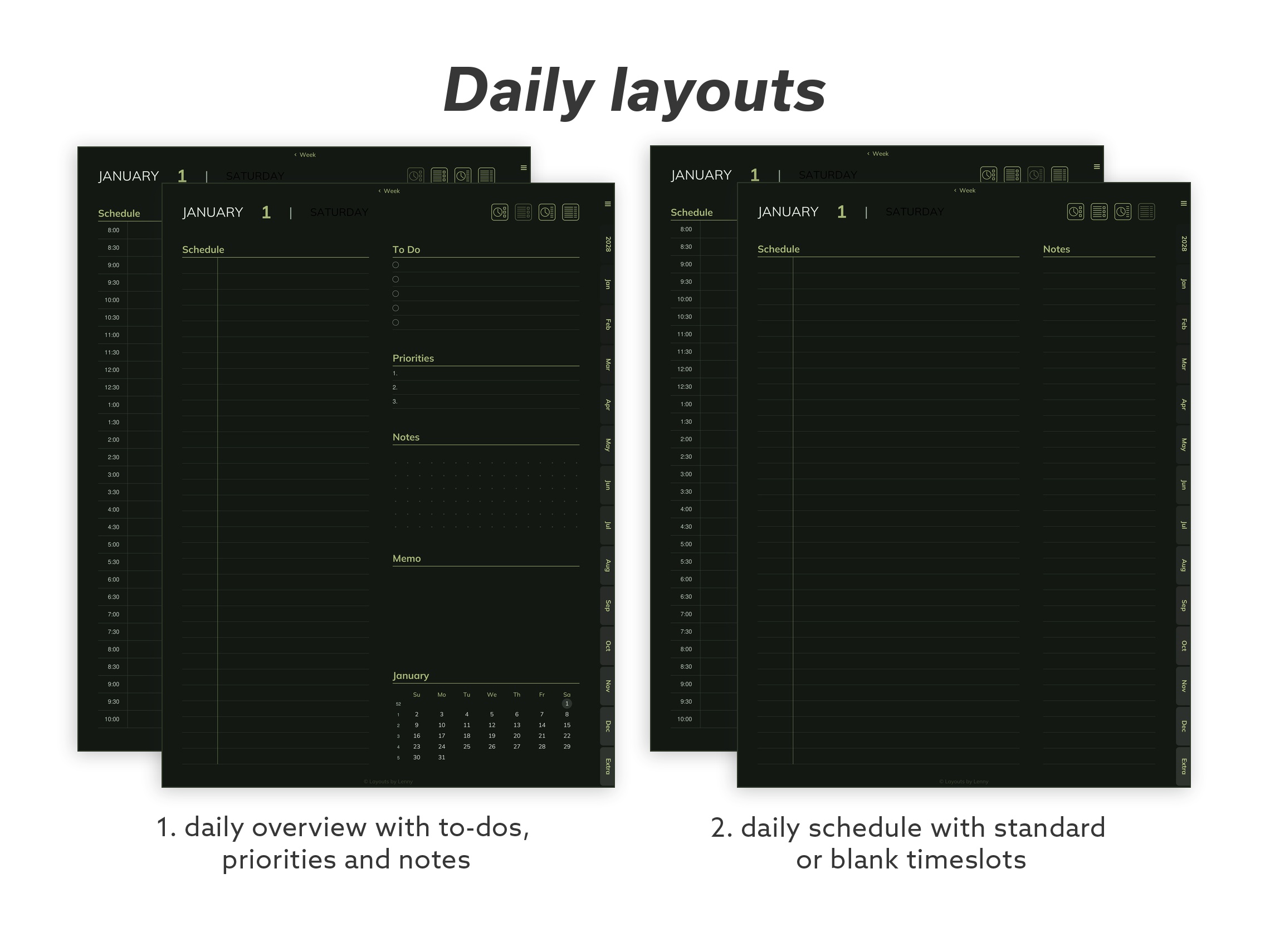 Focus – A curated set for everyday planning. Core calendar layouts, habit tracking, meal and sleep trackers, productivity tools, and essential note pages – without the extras.