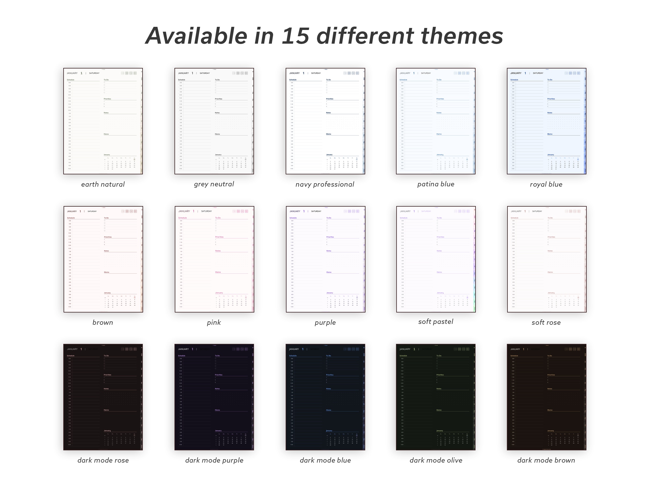 Focus – A curated set for everyday planning. Core calendar layouts, habit tracking, meal and sleep trackers, productivity tools, and essential note pages – without the extras.