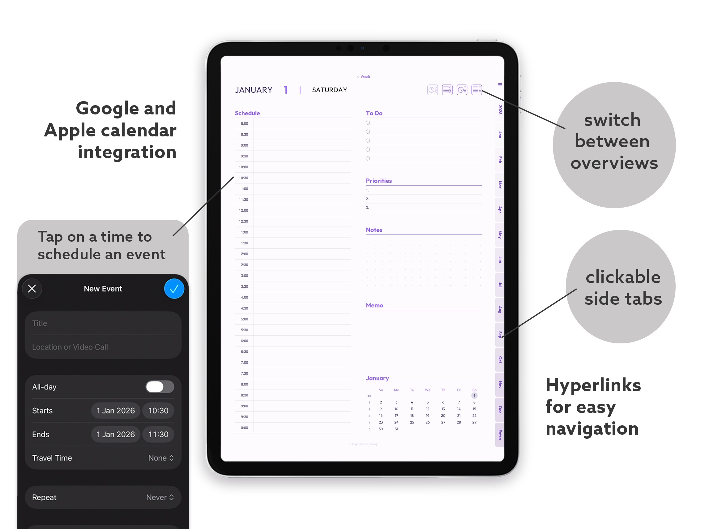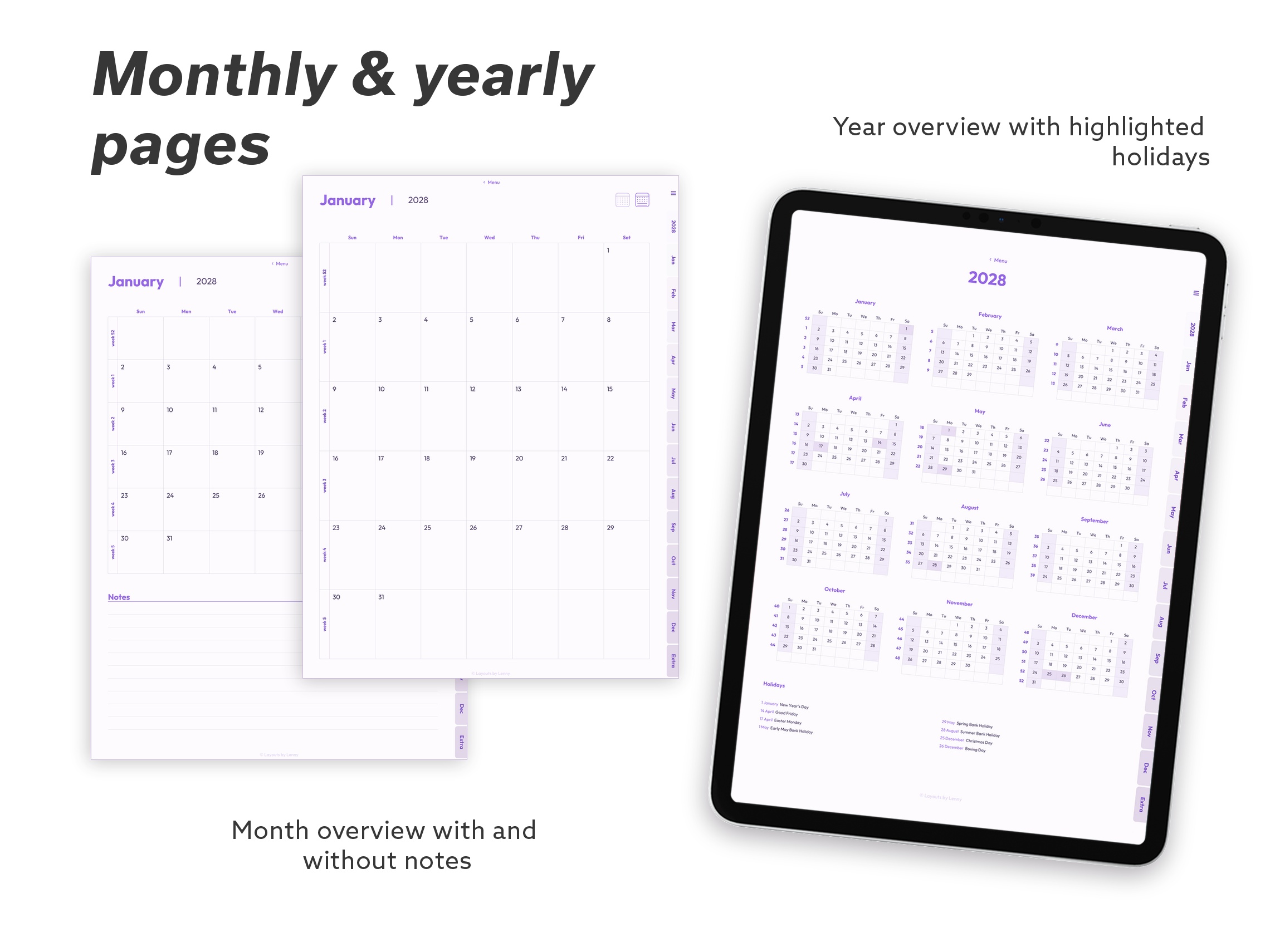 Focus – A curated set for everyday planning. Core calendar layouts, habit tracking, meal and sleep trackers, productivity tools, and essential note pages – without the extras.