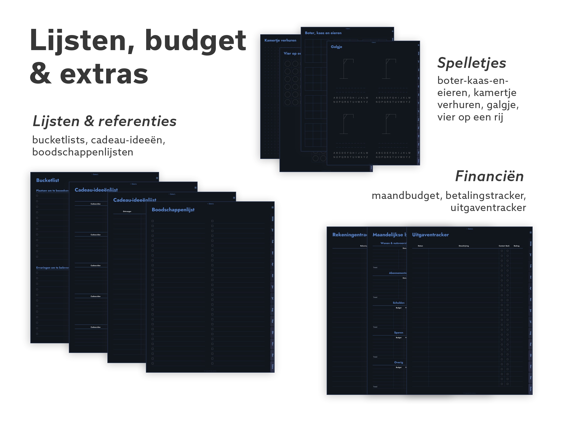 Elke layout, elke tool, elk papiertype. Meerdere week- en dagindelingen, doelen- en habittrackers, budgettools, wellnesspagina’s, dankbaarheidsjournal, Cornell-notities, speciaal papier (isometrisch, hex, notenbalken) en een paar klassieke spelletjes voor korte schermpauzes.