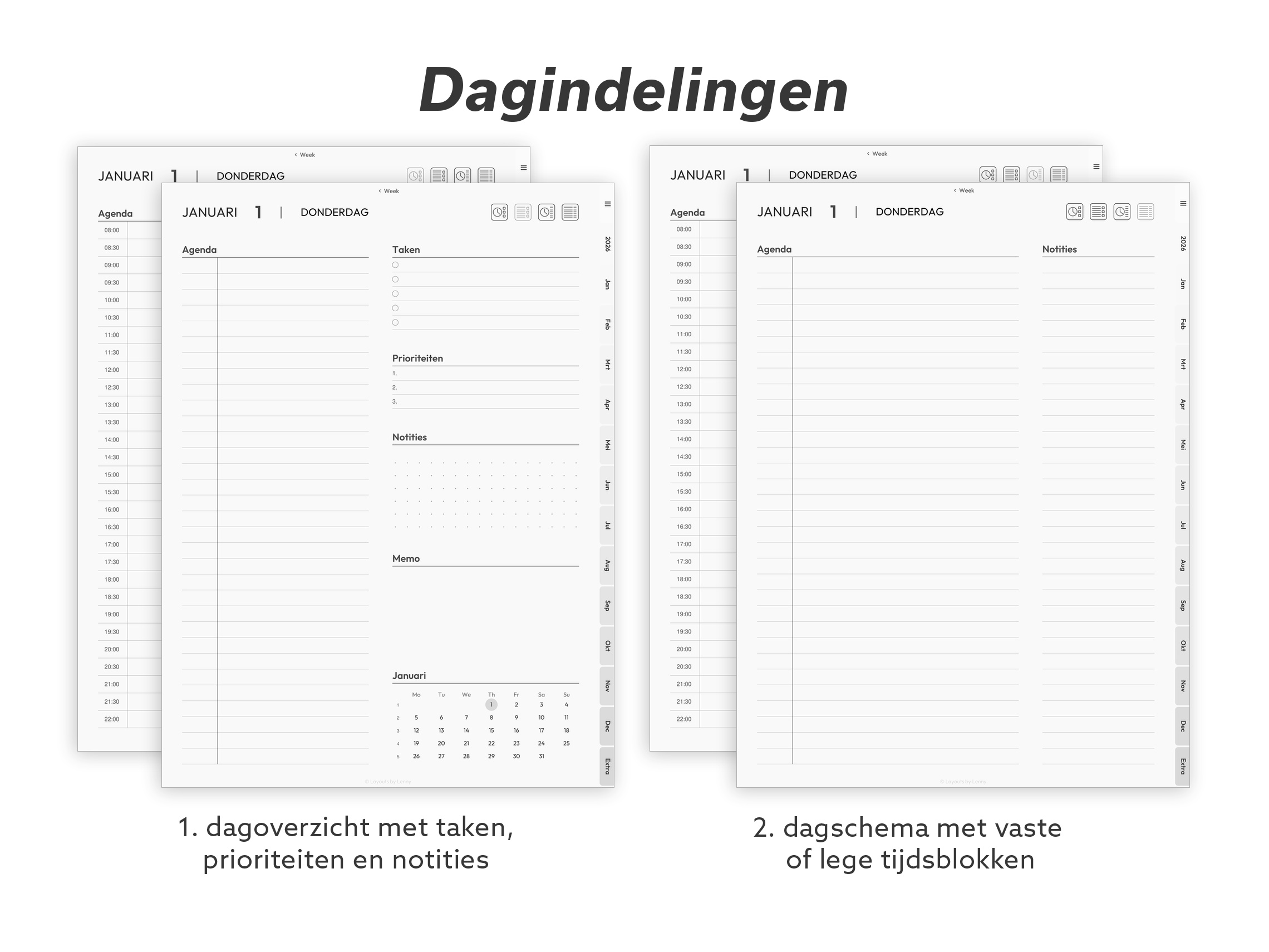 Doordacht ontworpen templates die zich aanpassen aan hoe jij écht werkt en leeft. Geen ingewikkelde layouts of drukke designs. Alleen eenvoudige, functionele pagina’s die je ruimte geven om te denken, plannen en focussen op wat echt belangrijk is.