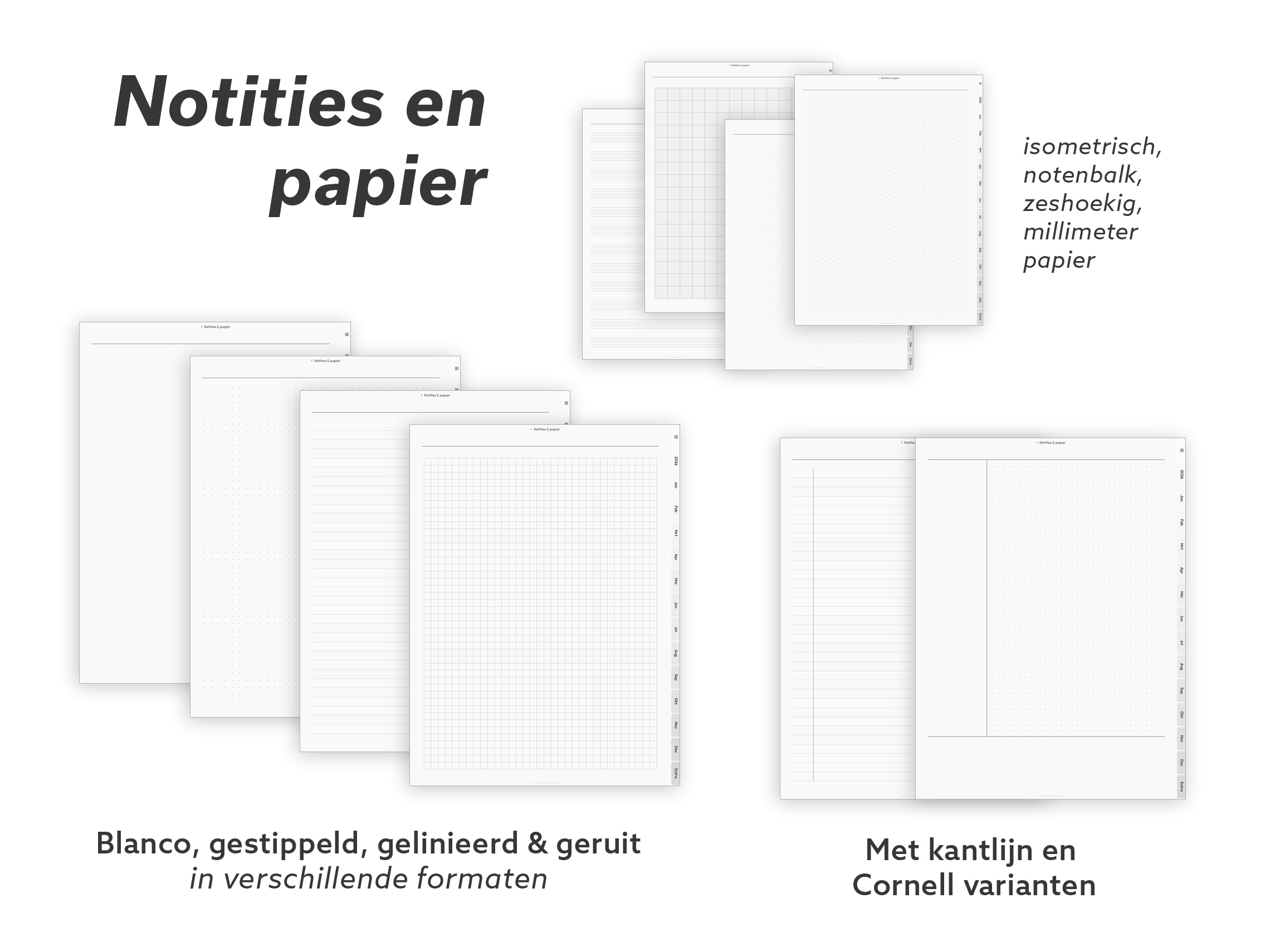 Elke layout, elke tool, elk papiertype. Meerdere week- en dagindelingen, doelen- en habittrackers, budgettools, wellnesspagina’s, dankbaarheidsjournal, Cornell-notities, speciaal papier (isometrisch, hex, notenbalken) en een paar klassieke spelletjes voor korte schermpauzes.
