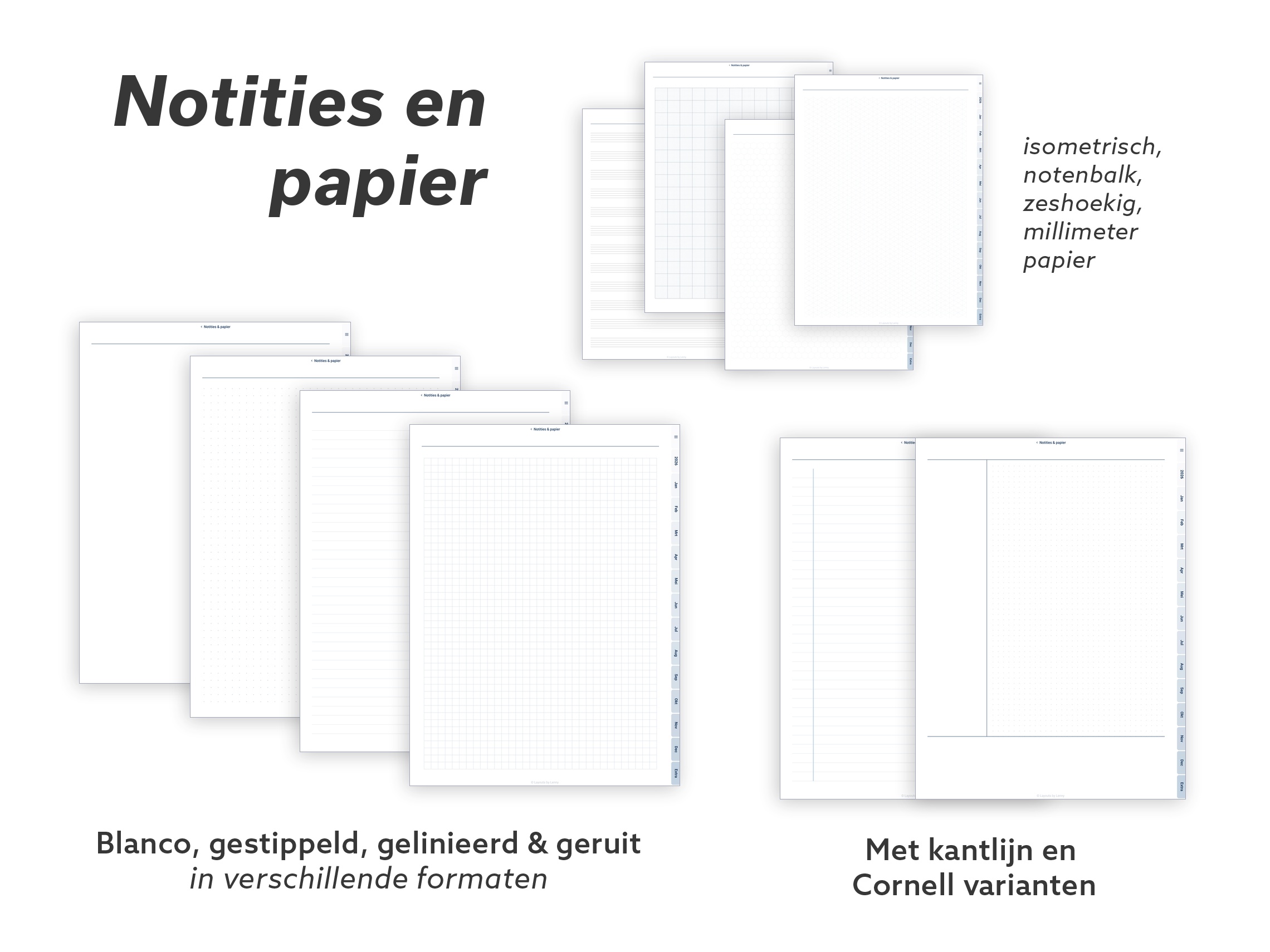 Elke layout, elke tool, elk papiertype. Meerdere week- en dagindelingen, doelen- en habittrackers, budgettools, wellnesspagina’s, dankbaarheidsjournal, Cornell-notities, speciaal papier (isometrisch, hex, notenbalken) en een paar klassieke spelletjes voor korte schermpauzes.