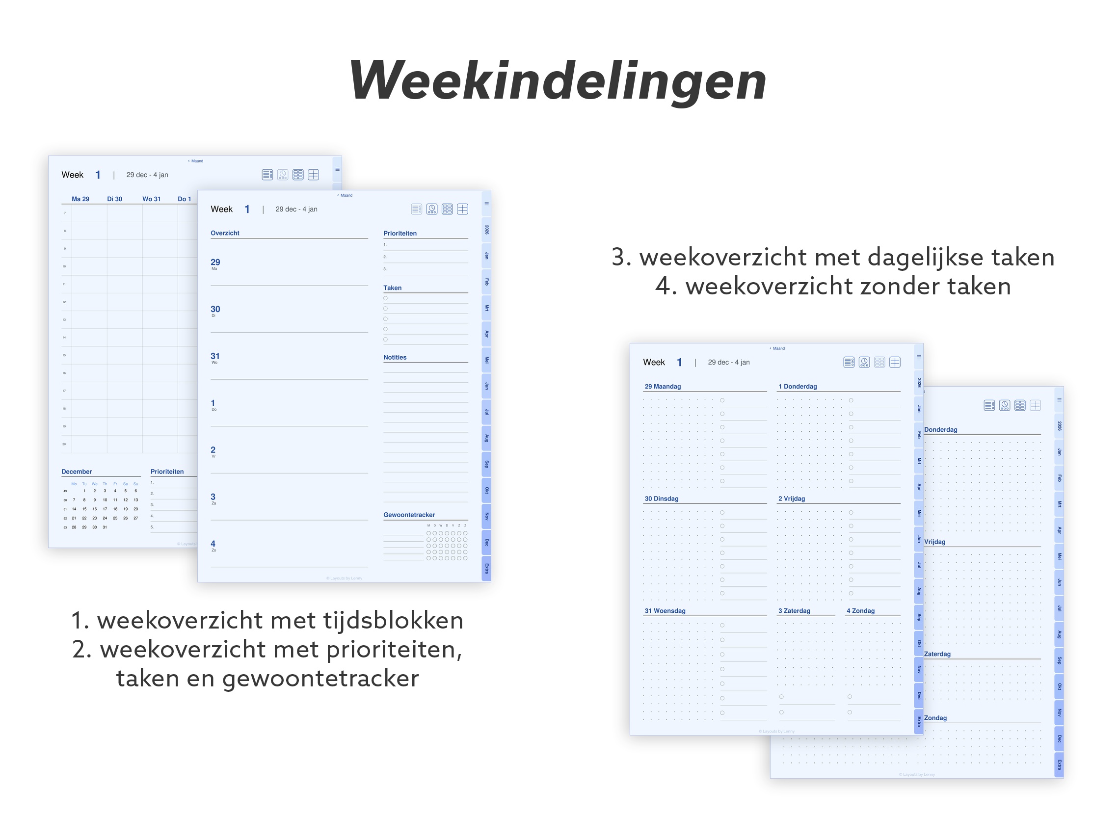Kies je versie, selecteer je weekstart (maandag of zondag), tijdnotatie (24u of AM/PM) en download je planner. Klaar.