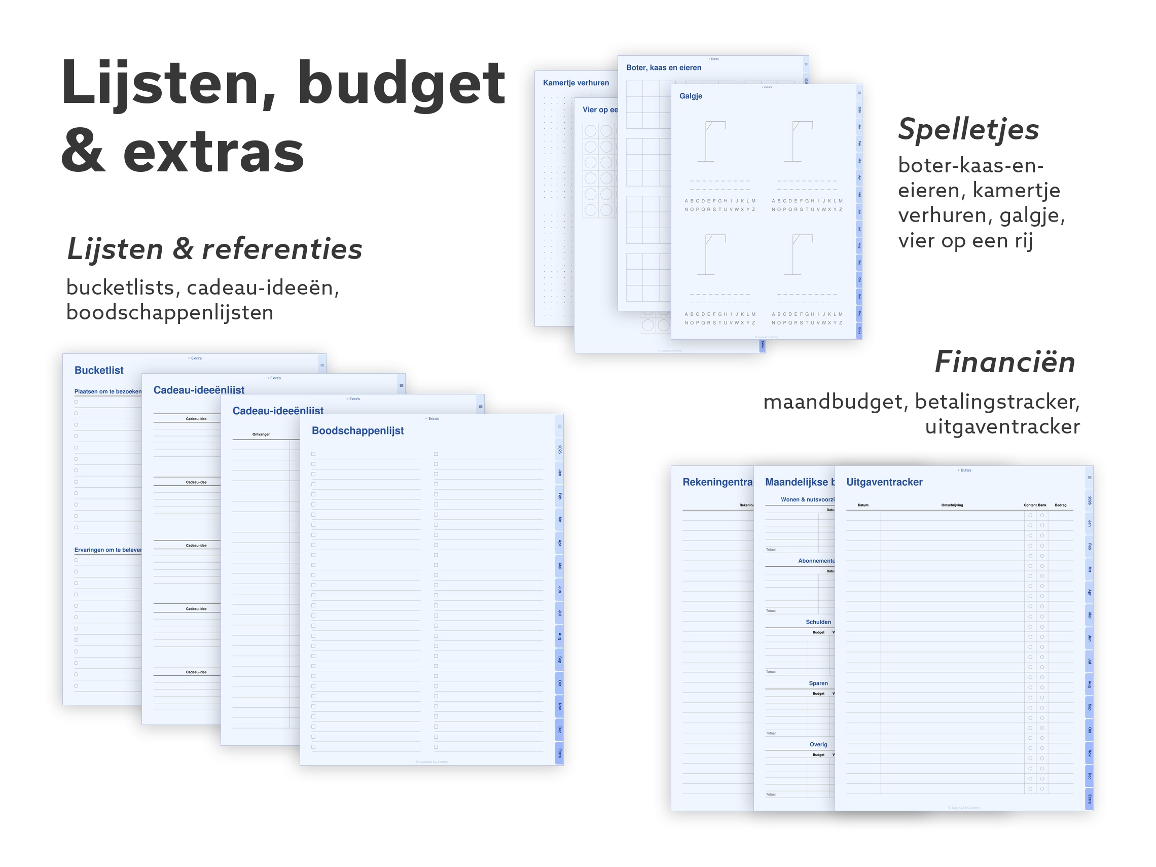Elke layout, elke tool, elk papiertype. Meerdere week- en dagindelingen, doelen- en habittrackers, budgettools, wellnesspagina’s, dankbaarheidsjournal, Cornell-notities, speciaal papier (isometrisch, hex, notenbalken) en een paar klassieke spelletjes voor korte schermpauzes.