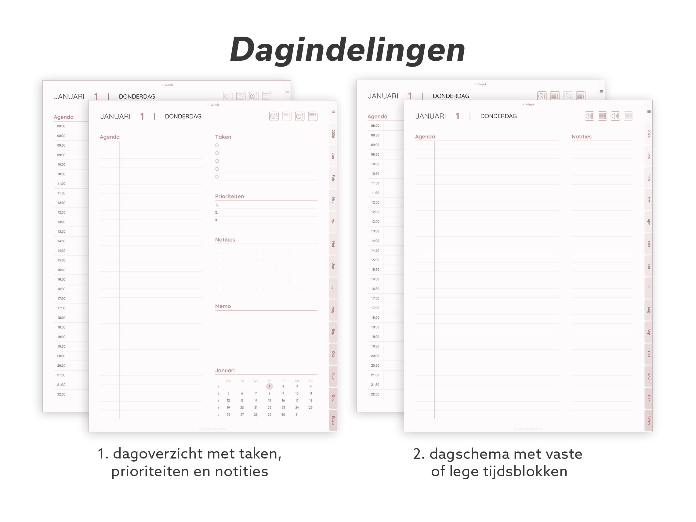 Doordacht ontworpen templates die zich aanpassen aan hoe jij écht werkt en leeft. Geen ingewikkelde layouts of drukke designs. Alleen eenvoudige, functionele pagina’s die je ruimte geven om te denken, plannen en focussen op wat echt belangrijk is.