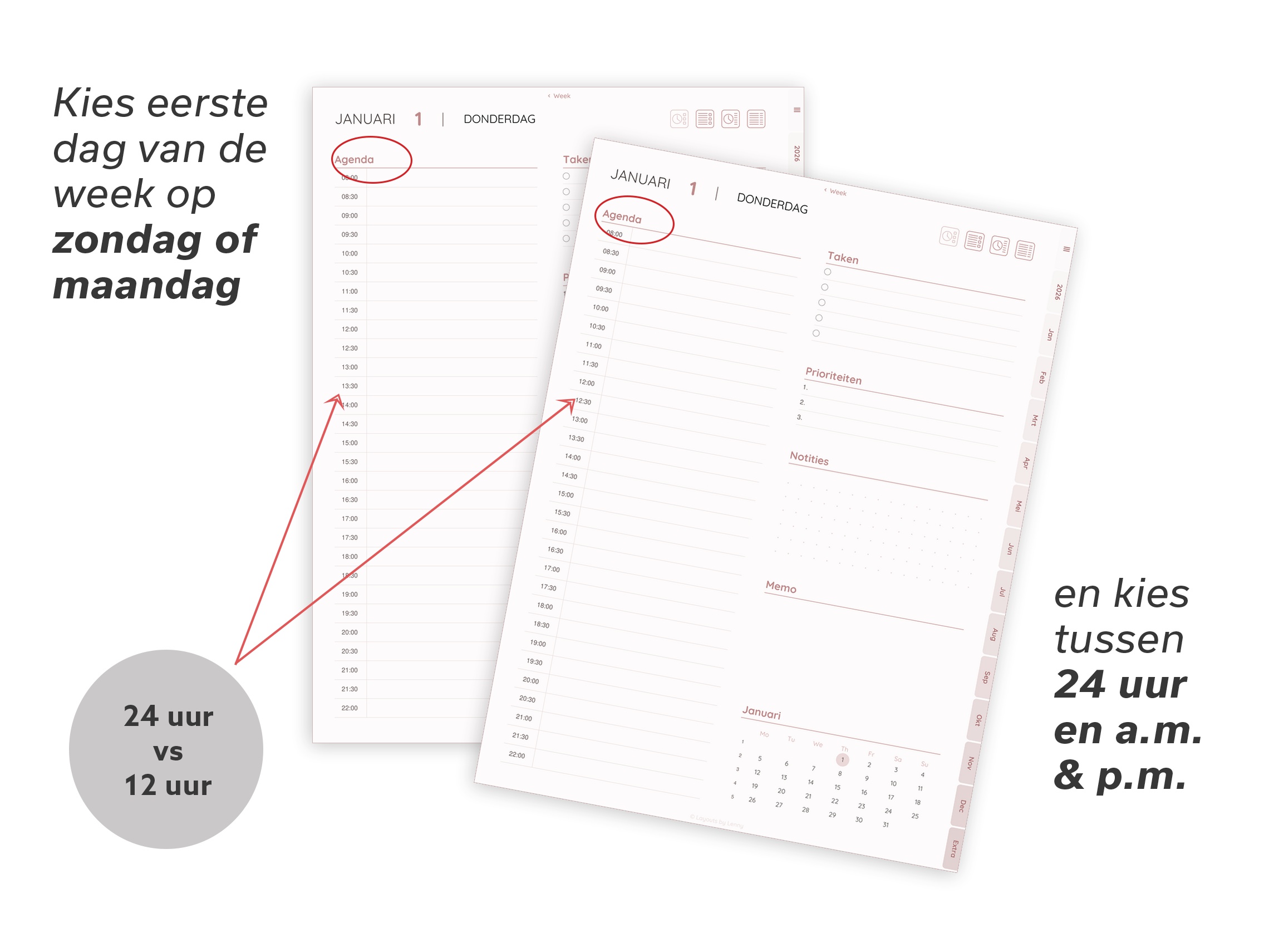 Kies je versie, selecteer je weekstart (maandag of zondag), tijdnotatie (24u of AM/PM) en download je planner. Klaar.