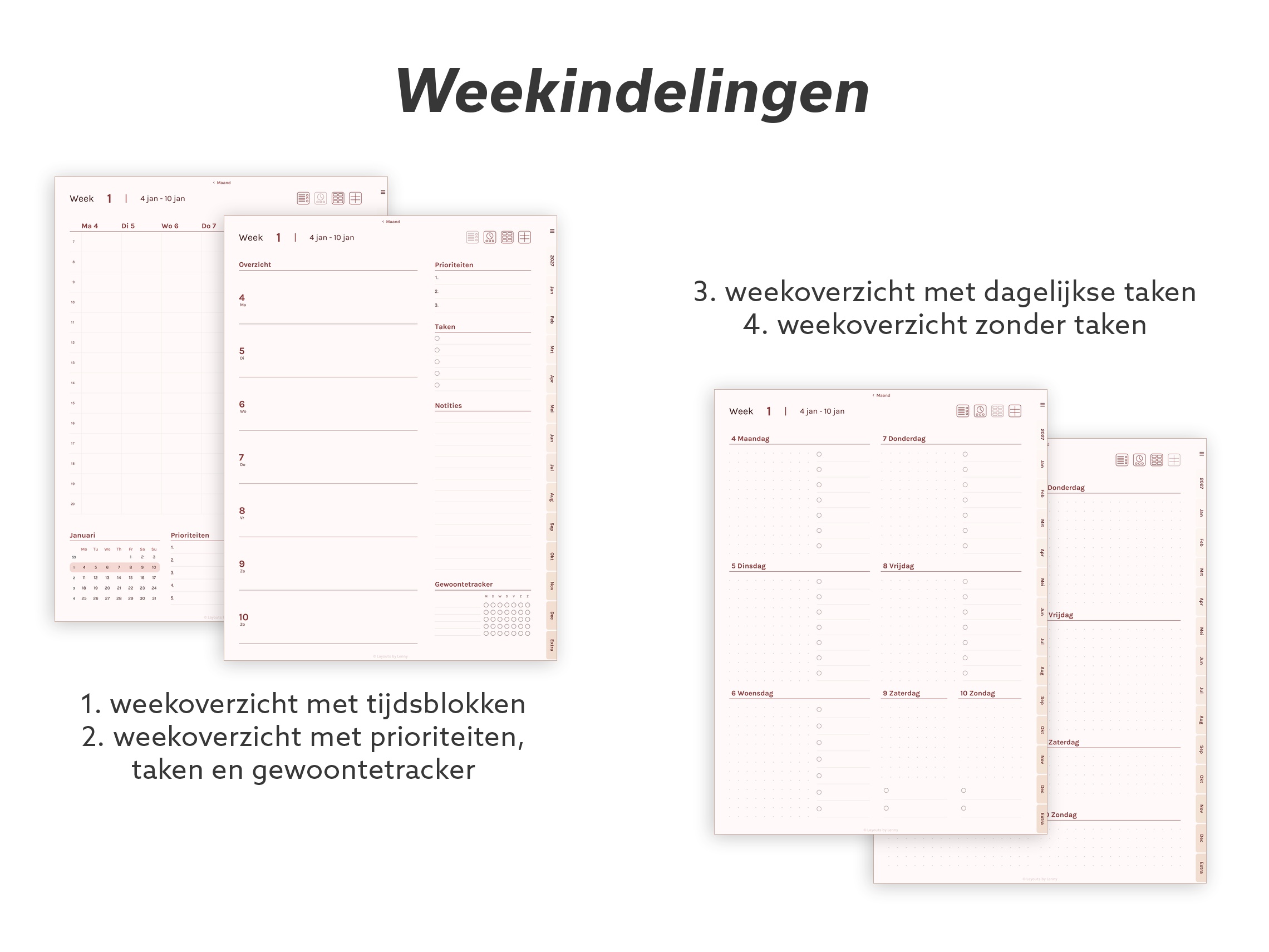 Kies je versie, selecteer je weekstart (maandag of zondag), tijdnotatie (24u of AM/PM) en download je planner. Klaar.