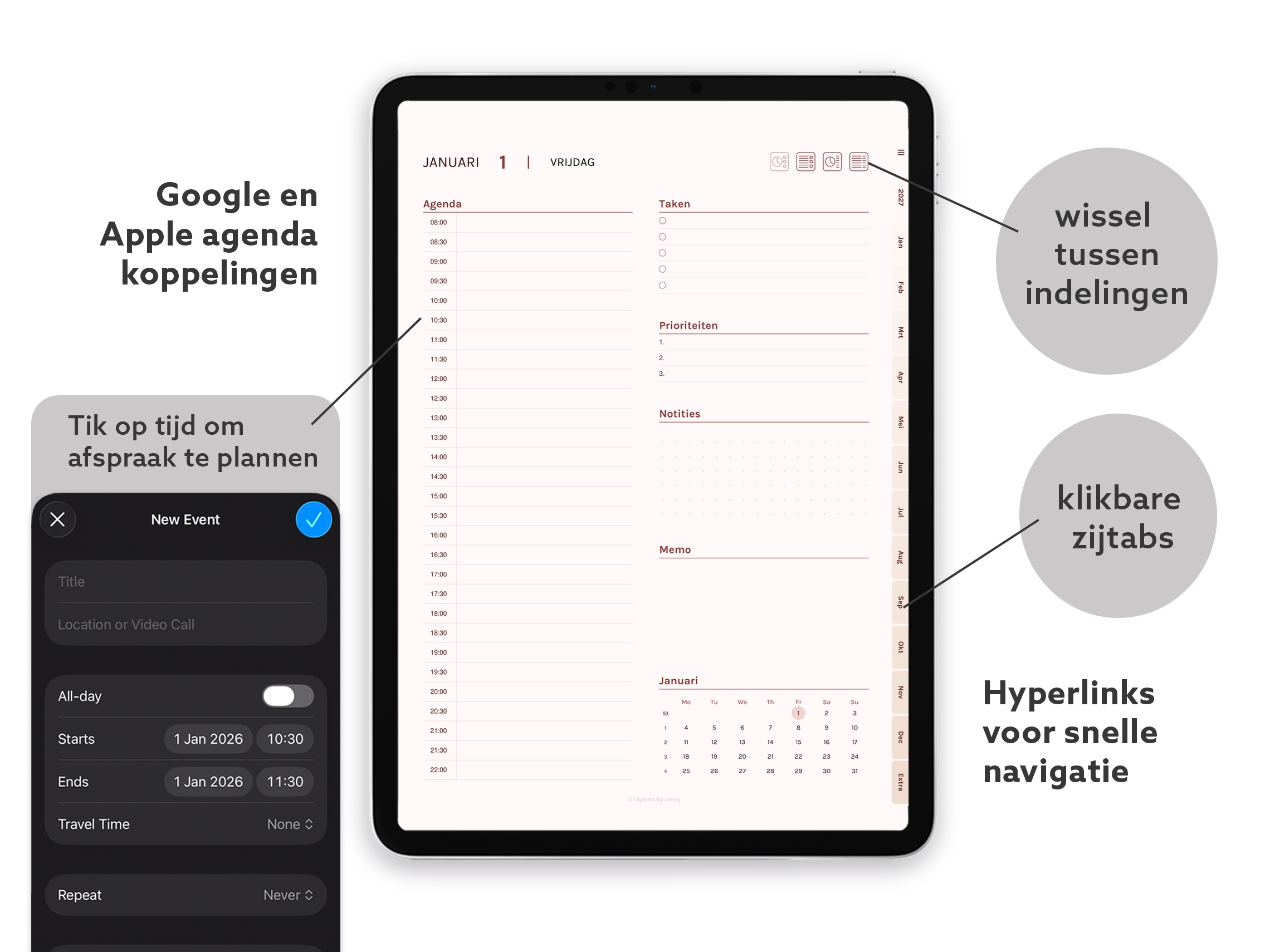 Met agendakoppelingen kun je met 1 tik een nieuwe afspraak in je Google of Apple agenda toevoegen.