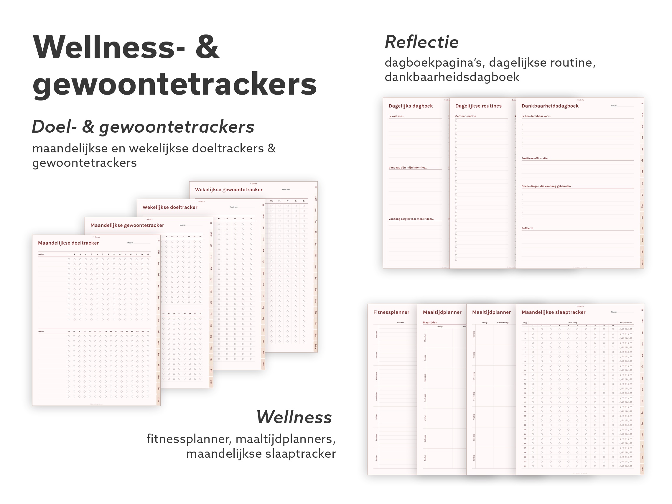 Elke layout, elke tool, elk papiertype. Meerdere week- en dagindelingen, doelen- en habittrackers, budgettools, wellnesspagina’s, dankbaarheidsjournal, Cornell-notities, speciaal papier (isometrisch, hex, notenbalken) en een paar klassieke spelletjes voor korte schermpauzes.