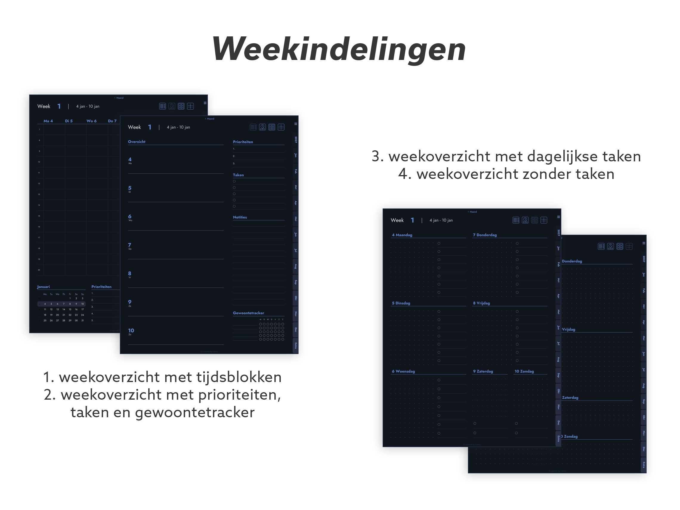 Elke layout, elke tool, elk papiertype. Meerdere week- en dagindelingen, doelen- en habittrackers, budgettools, wellnesspagina’s, dankbaarheidsjournal, Cornell-notities, speciaal papier (isometrisch, hex, notenbalken) en een paar klassieke spelletjes voor korte schermpauzes.
