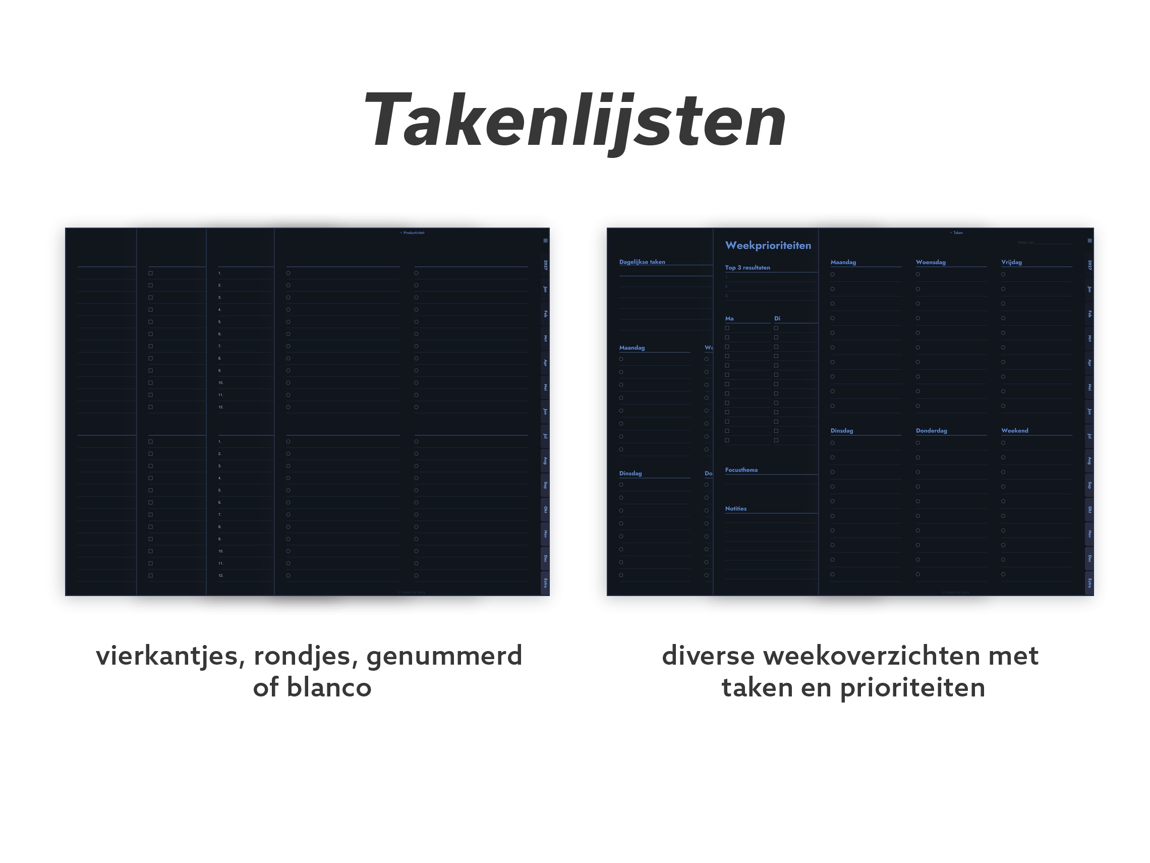 Doordacht ontworpen templates die zich aanpassen aan hoe jij écht werkt en leeft. Geen ingewikkelde layouts of drukke designs. Alleen eenvoudige, functionele pagina’s die je ruimte geven om te denken, plannen en focussen op wat echt belangrijk is.
