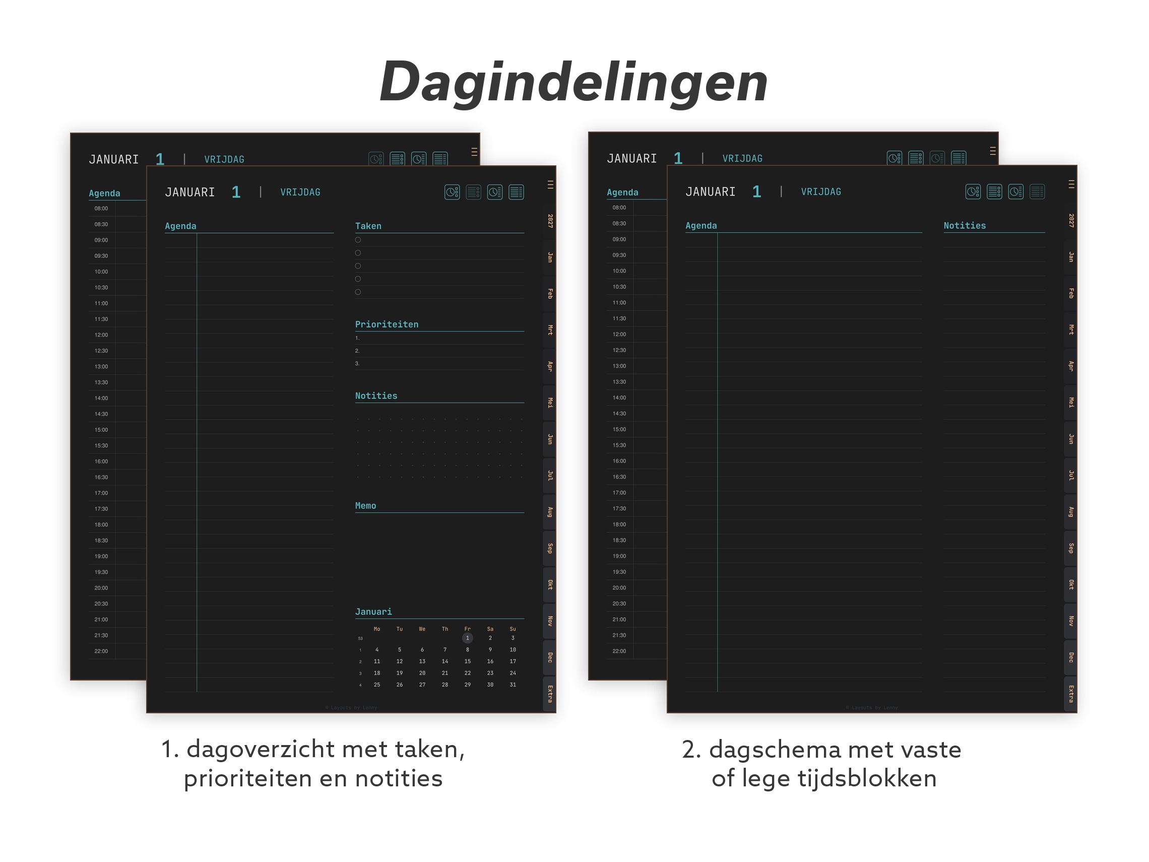 Doordacht ontworpen templates die zich aanpassen aan hoe jij écht werkt en leeft. Geen ingewikkelde layouts of drukke designs. Alleen eenvoudige, functionele pagina’s die je ruimte geven om te denken, plannen en focussen op wat echt belangrijk is.