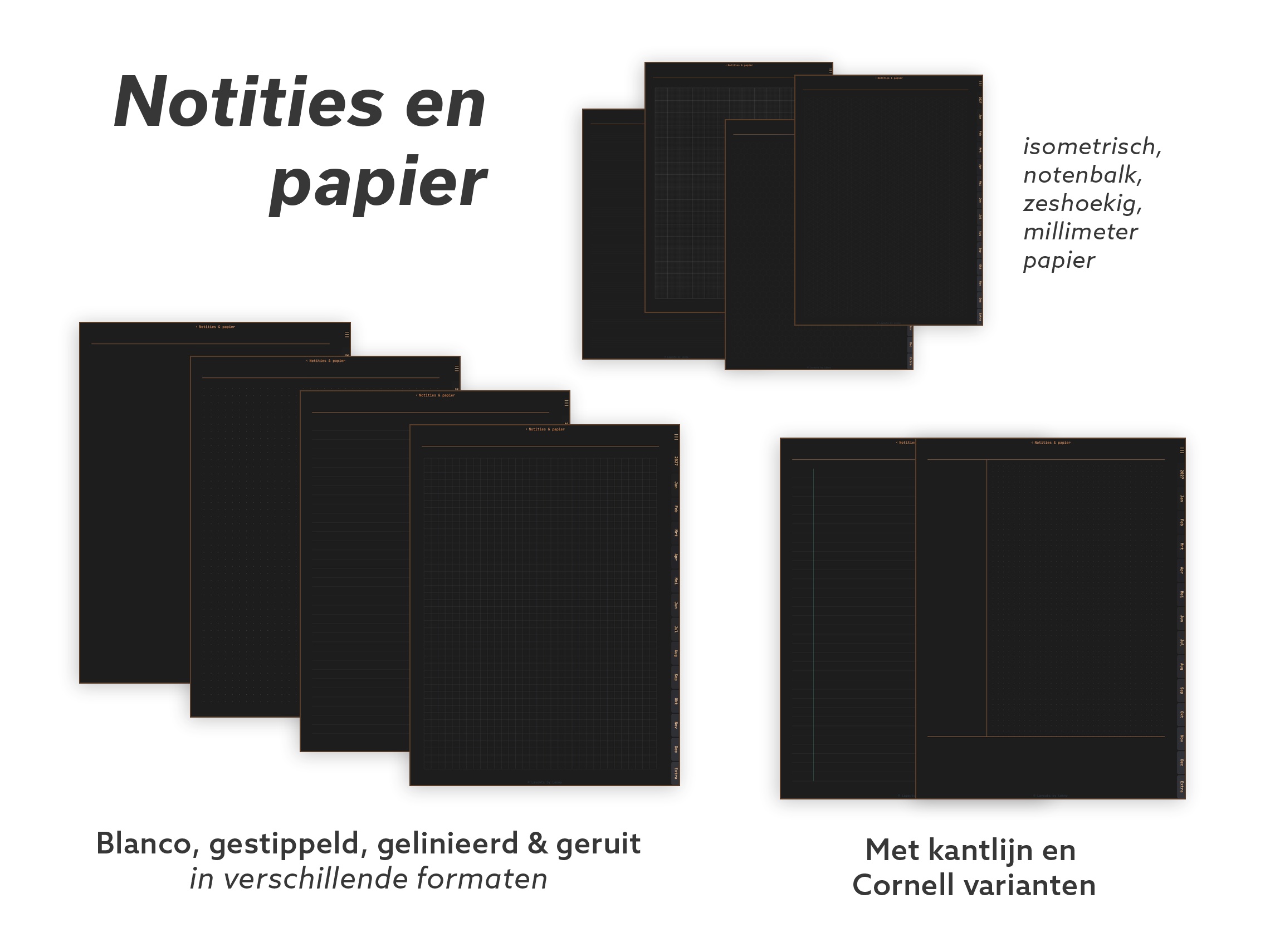 Elke layout, elke tool, elk papiertype. Meerdere week- en dagindelingen, doelen- en habittrackers, budgettools, wellnesspagina’s, dankbaarheidsjournal, Cornell-notities, speciaal papier (isometrisch, hex, notenbalken) en een paar klassieke spelletjes voor korte schermpauzes.