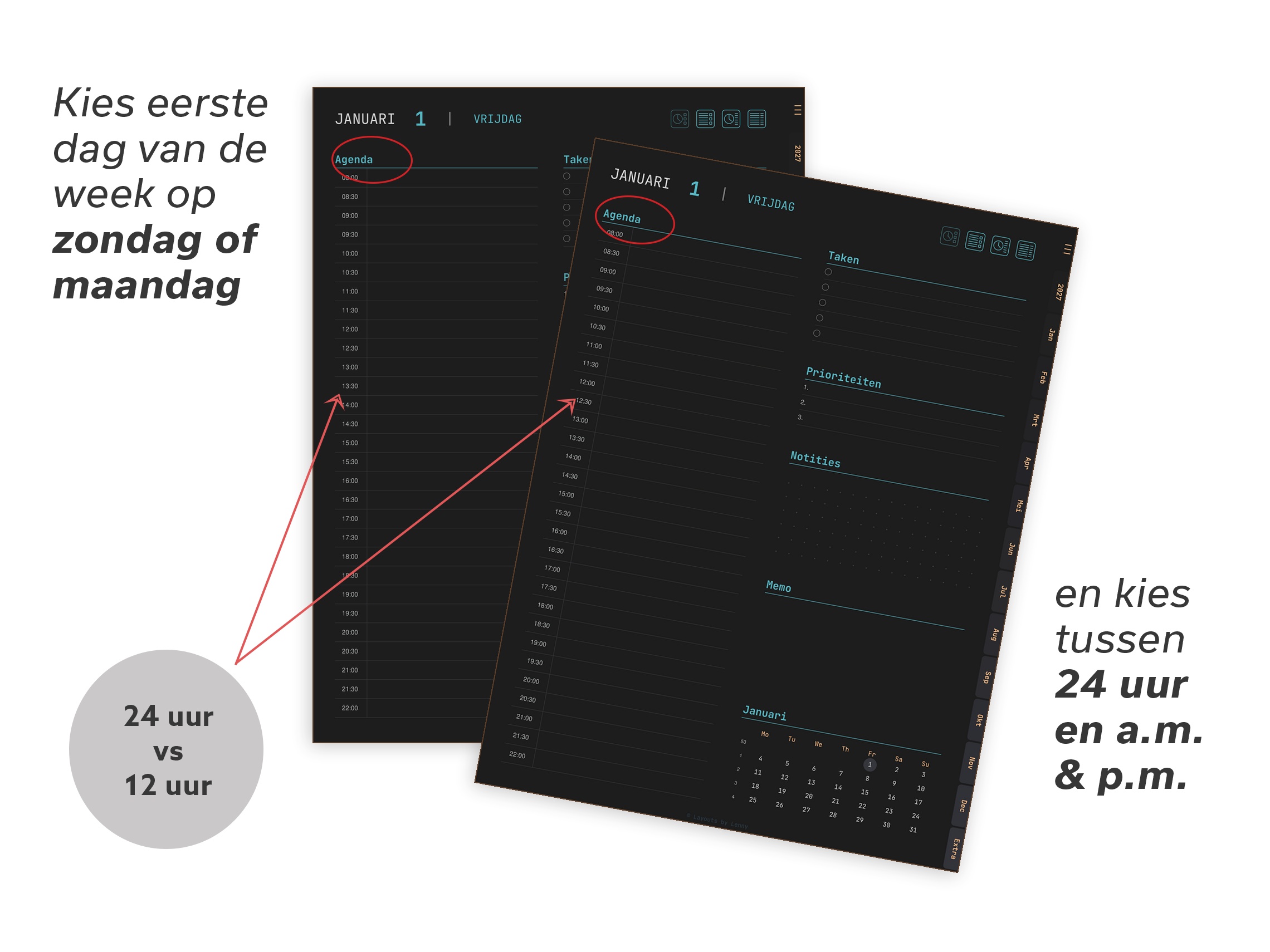 Kies je versie, selecteer je weekstart (maandag of zondag), tijdnotatie (24u of AM/PM) en download je planner. Klaar.