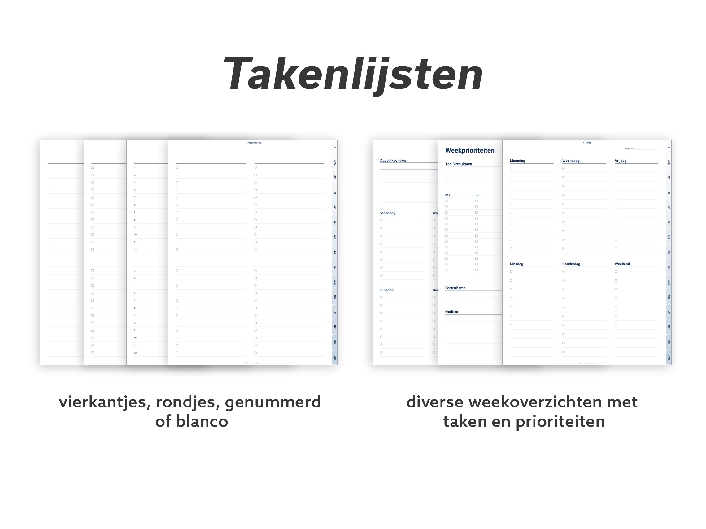 Doordacht ontworpen templates die zich aanpassen aan hoe jij écht werkt en leeft. Geen ingewikkelde layouts of drukke designs. Alleen eenvoudige, functionele pagina’s die je ruimte geven om te denken, plannen en focussen op wat echt belangrijk is.