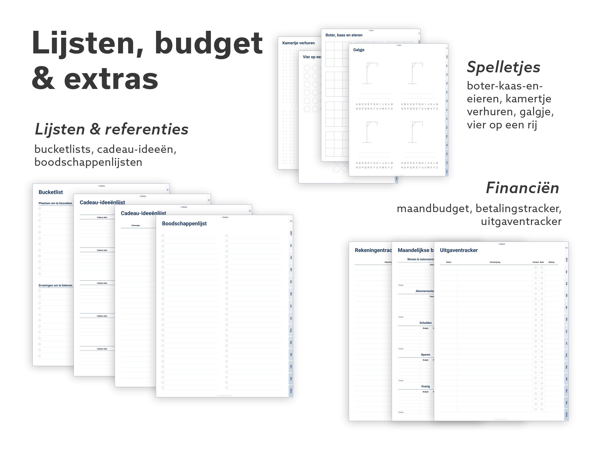 Elke layout, elke tool, elk papiertype. Meerdere week- en dagindelingen, doelen- en habittrackers, budgettools, wellnesspagina’s, dankbaarheidsjournal, Cornell-notities, speciaal papier (isometrisch, hex, notenbalken) en een paar klassieke spelletjes voor korte schermpauzes.