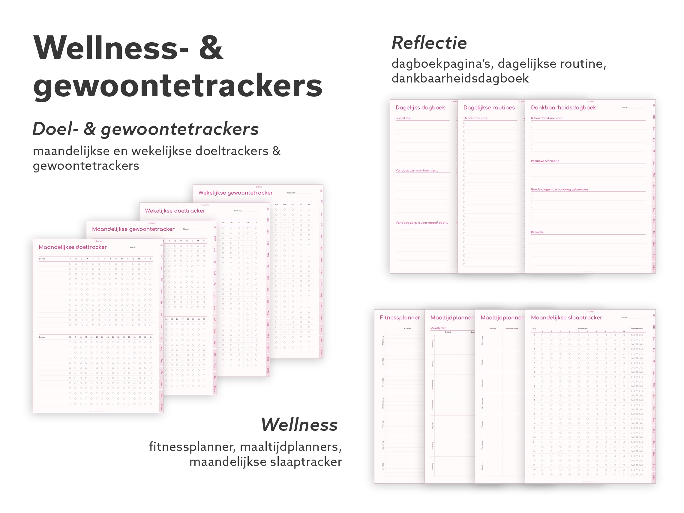 Elke layout, elke tool, elk papiertype. Meerdere week- en dagindelingen, doelen- en habittrackers, budgettools, wellnesspagina’s, dankbaarheidsjournal, Cornell-notities, speciaal papier (isometrisch, hex, notenbalken) en een paar klassieke spelletjes voor korte schermpauzes.