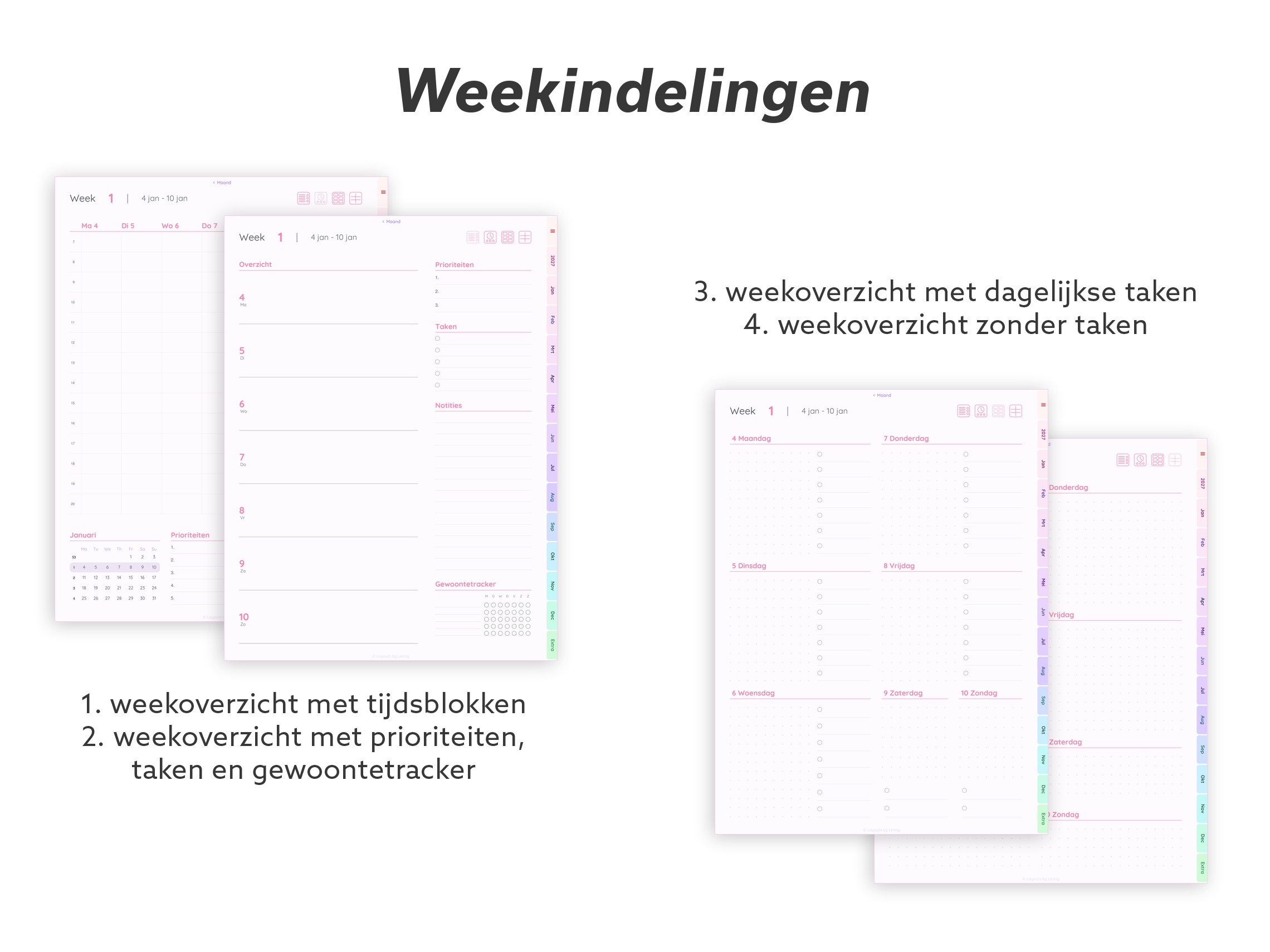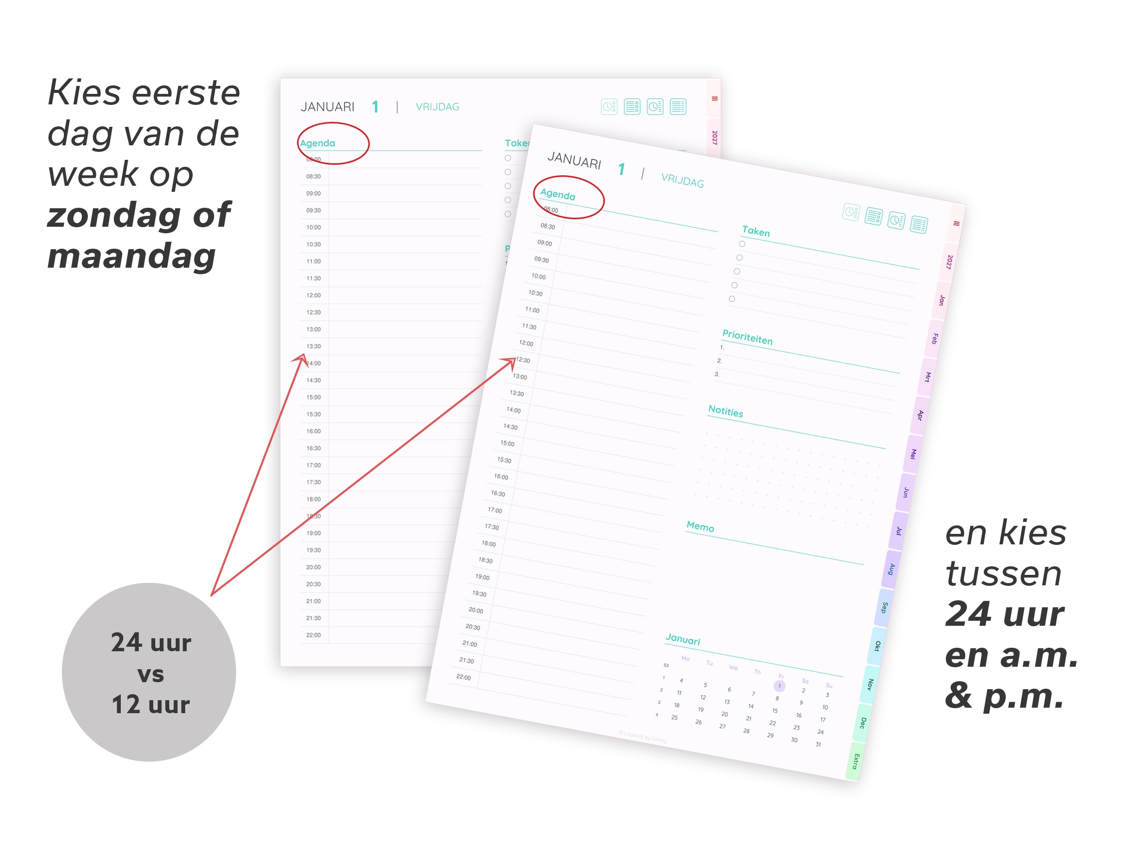 Kies je versie, selecteer je weekstart (maandag of zondag), tijdnotatie (24u of AM/PM) en download je planner. Klaar.