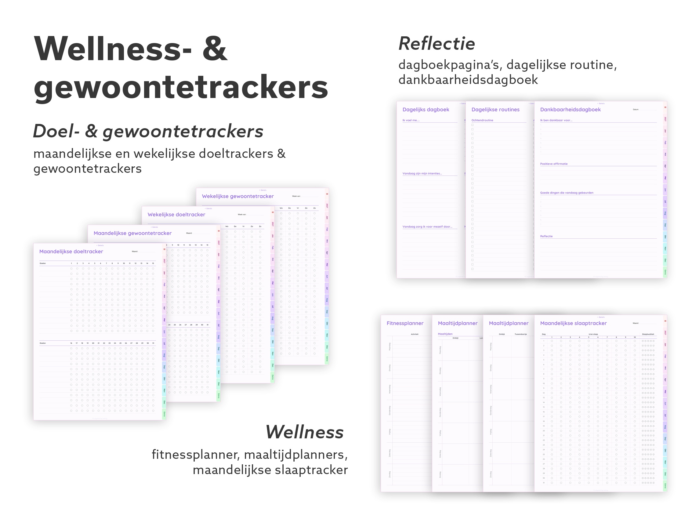 Elke layout, elke tool, elk papiertype. Meerdere week- en dagindelingen, doelen- en habittrackers, budgettools, wellnesspagina’s, dankbaarheidsjournal, Cornell-notities, speciaal papier (isometrisch, hex, notenbalken) en een paar klassieke spelletjes voor korte schermpauzes.
