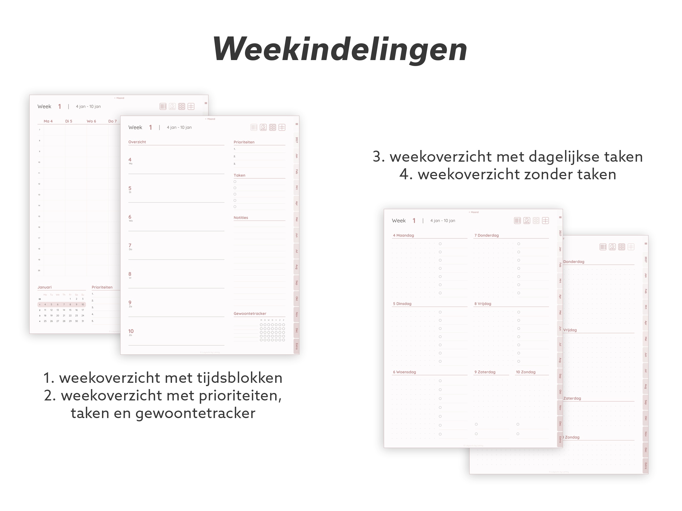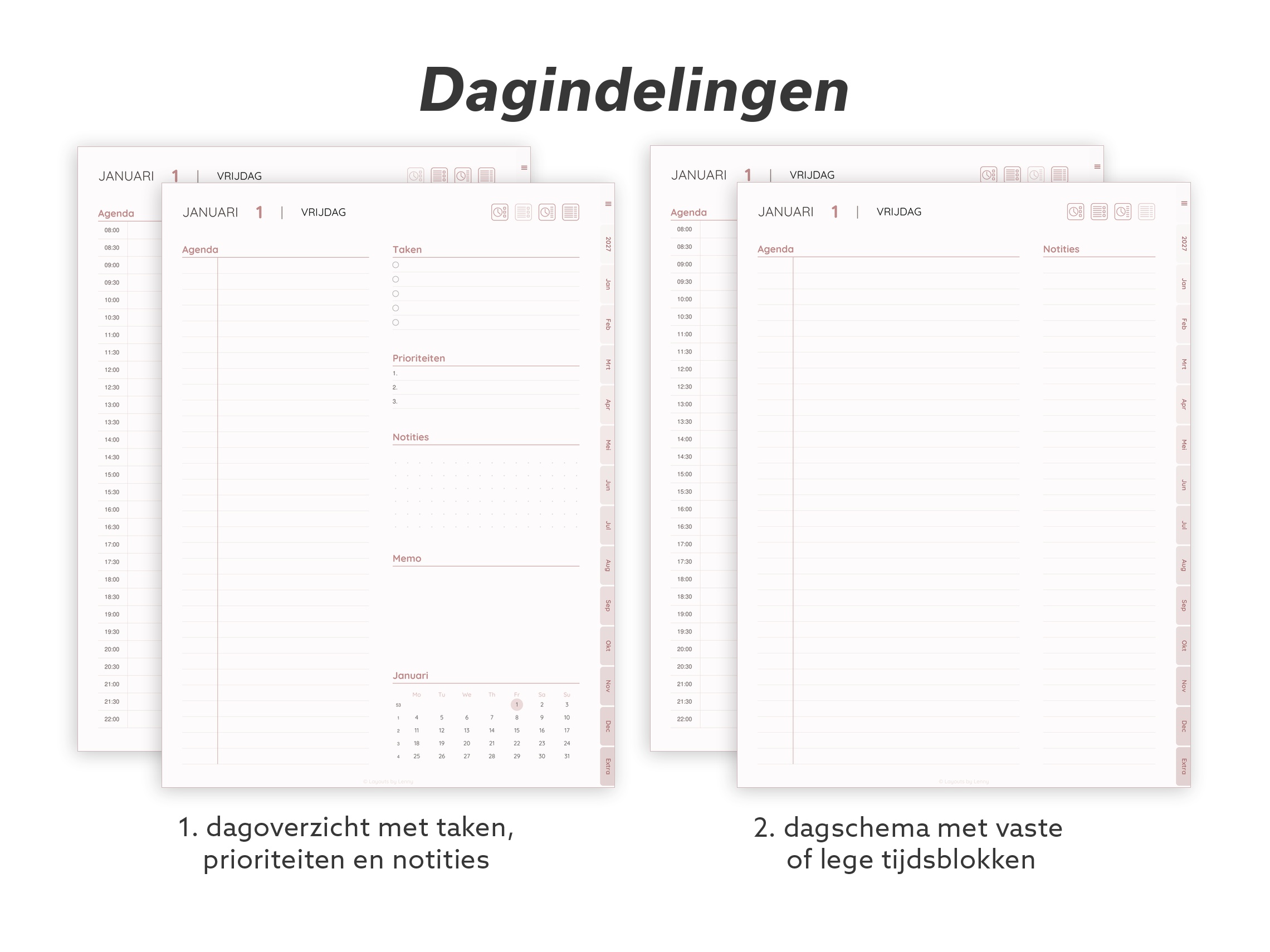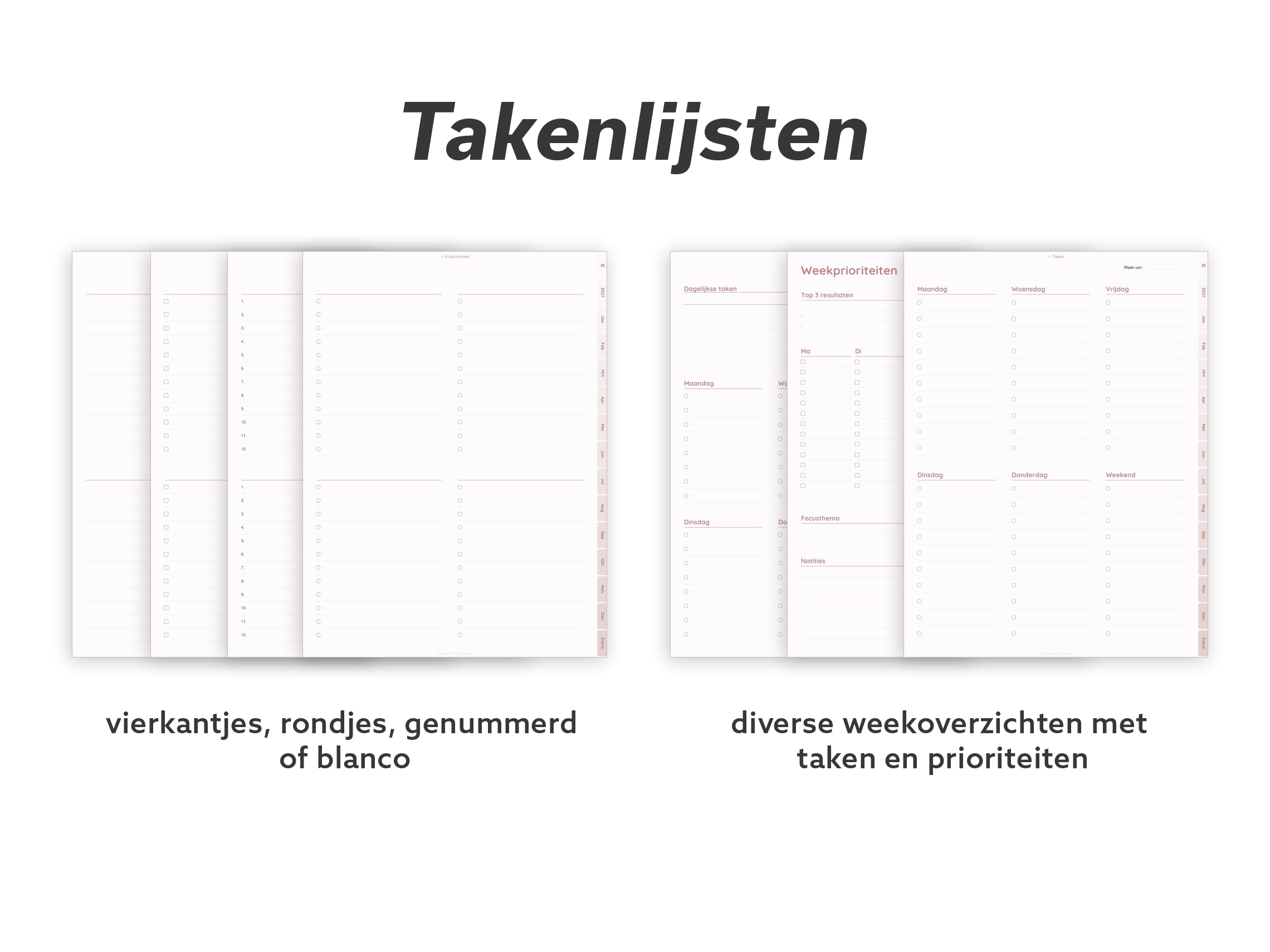 Doordacht ontworpen templates die zich aanpassen aan hoe jij écht werkt en leeft. Geen ingewikkelde layouts of drukke designs. Alleen eenvoudige, functionele pagina’s die je ruimte geven om te denken, plannen en focussen op wat echt belangrijk is.