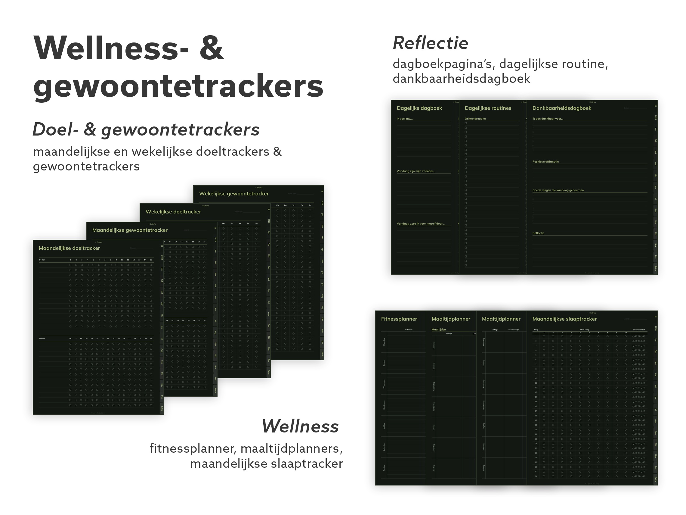 Elke layout, elke tool, elk papiertype. Meerdere week- en dagindelingen, doelen- en habittrackers, budgettools, wellnesspagina’s, dankbaarheidsjournal, Cornell-notities, speciaal papier (isometrisch, hex, notenbalken) en een paar klassieke spelletjes voor korte schermpauzes.