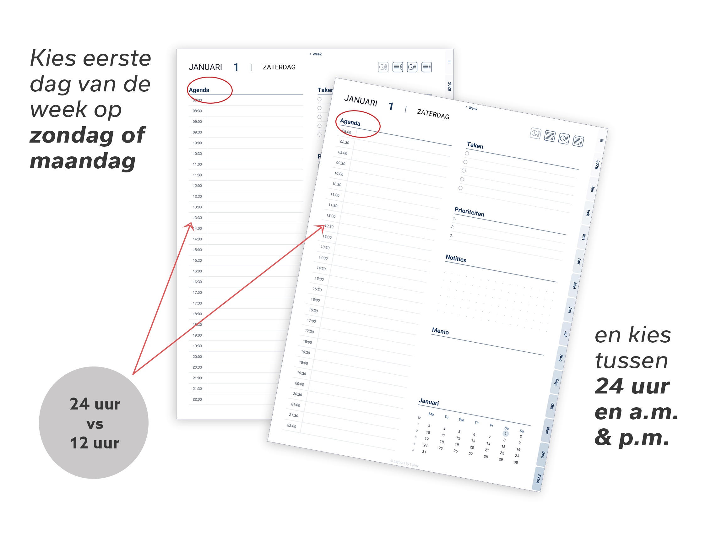Kies je versie, selecteer je weekstart (maandag of zondag), tijdnotatie (24u of AM/PM) en download je planner. Klaar.