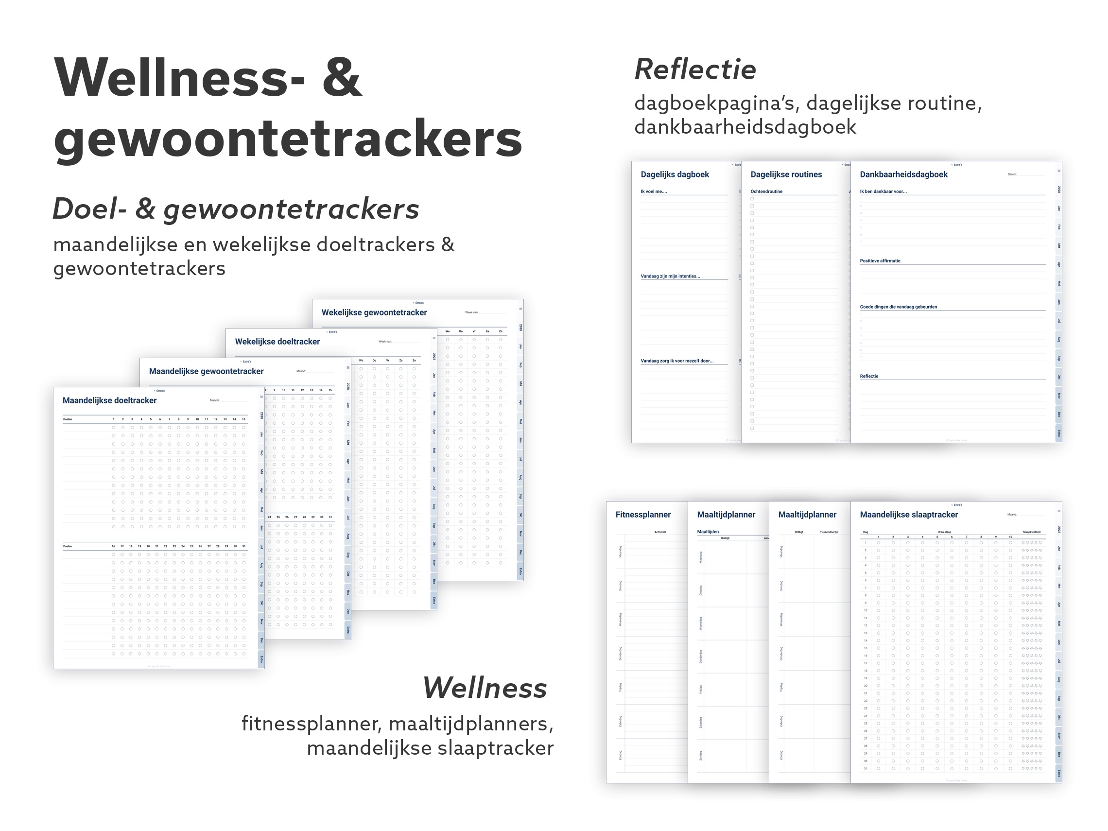 Elke layout, elke tool, elk papiertype. Meerdere week- en dagindelingen, doelen- en habittrackers, budgettools, wellnesspagina’s, dankbaarheidsjournal, Cornell-notities, speciaal papier (isometrisch, hex, notenbalken) en een paar klassieke spelletjes voor korte schermpauzes.